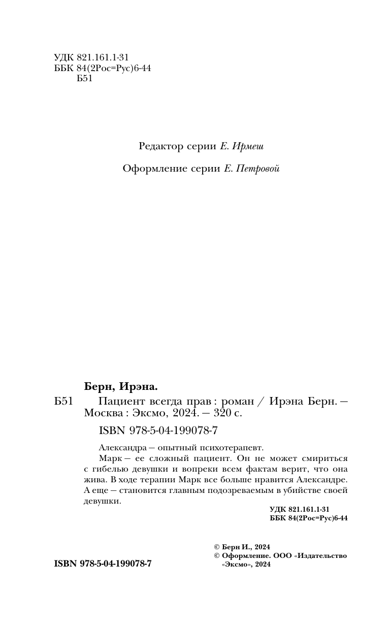 Книга: Пациент всегда прав (Ирэна Берн); Эксмо, Редакция 1, 2024