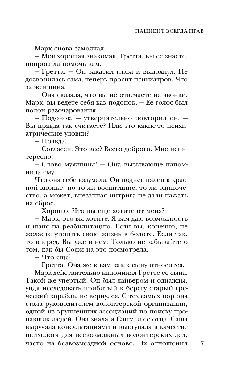 Он не может смириться с гибелью девушки и вопреки всем фактам верит, что она жива. В ходе терапии Марк все больше нравится Александре. А еще — становится главным подозреваемым в убийстве своей девушки.