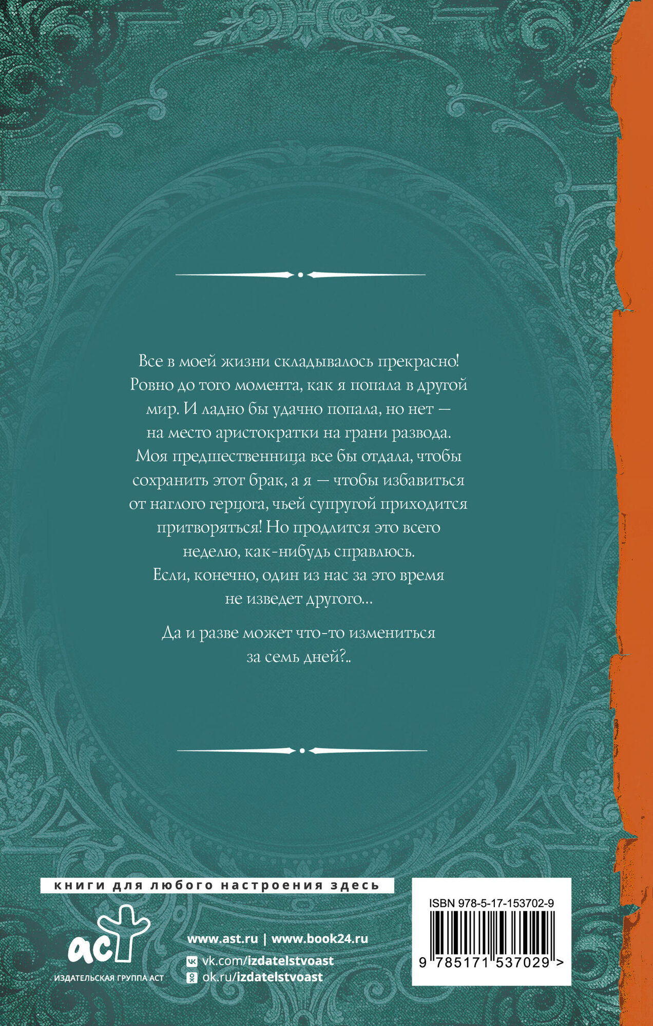 Все в моей жизни складывалось прекрасно! Ровно до того момента, как я попала в другой мир. И ладно бы удачно попала, но нет — на место аристократки на грани развода. Моя предшественница все бы отдала, чтобы сохранить этот брак, а я — чтобы избавиться от наглого герцога, чьей супругой приходится притворяться! Но продлится это всего неделю, как-нибудь справлюсь. Если, конечно, один из нас за это время не изведет другого… Да и разве может что-то измениться за семь дней?..