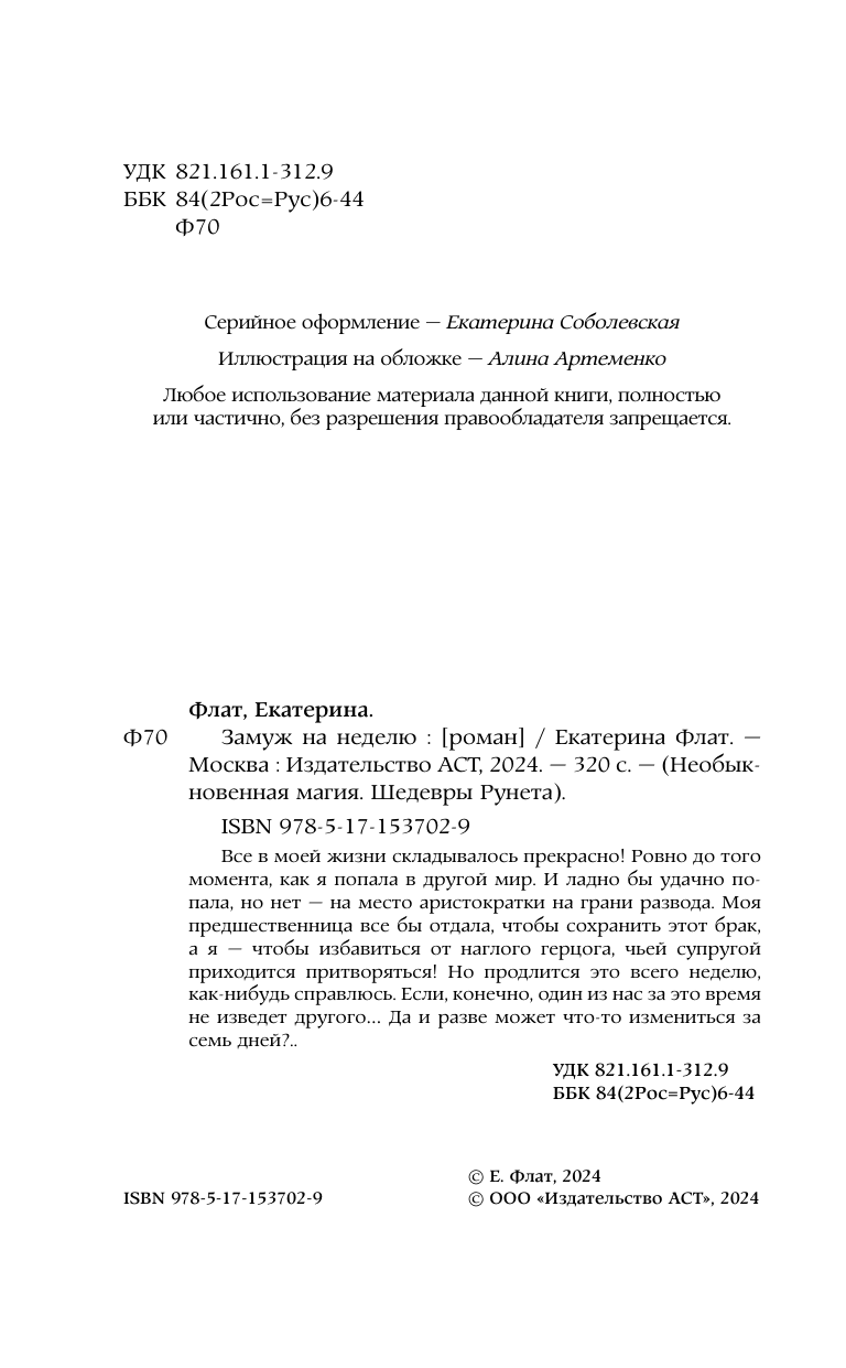 Книга: Замуж на неделю (Екатерина Владимировна Флат); АСТ, 2024
