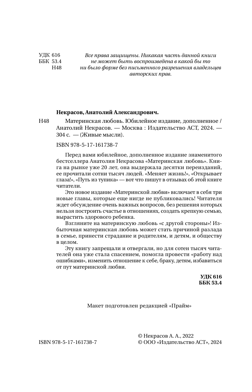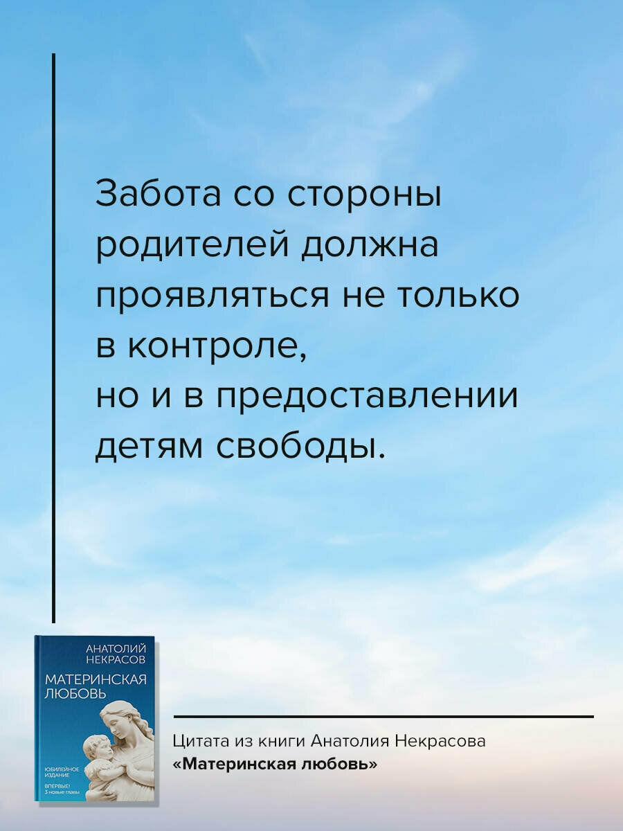 Перед вами юбилейное, дополненное издание знаменитого бестселлера Анатолия Некрасова "Материнская любовь". Книга на рынке уже 20 лет, она выдержала десятки переизданий, ее прочитали сотни тысяч людей. "Меняет жизнь!", "Открывает глаза!", "Путь из тупика" — вот что пишут в отзывах об этой книге читатели.