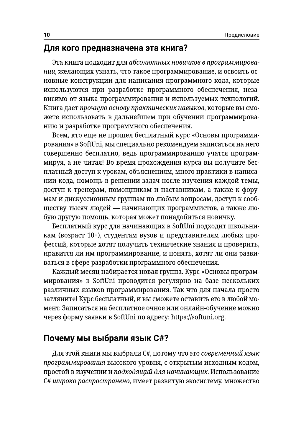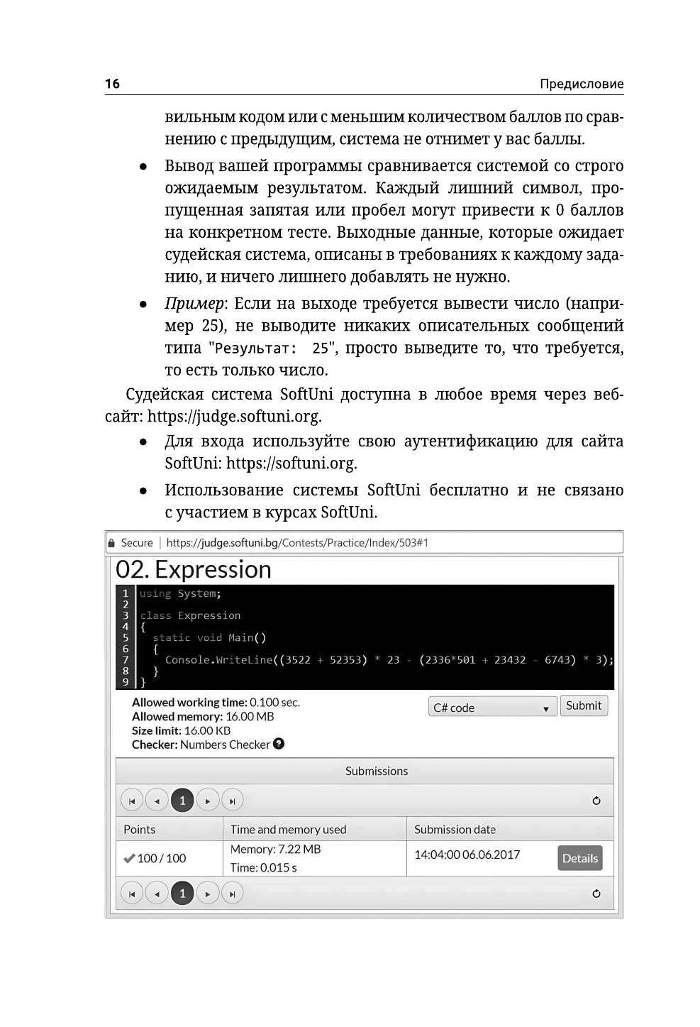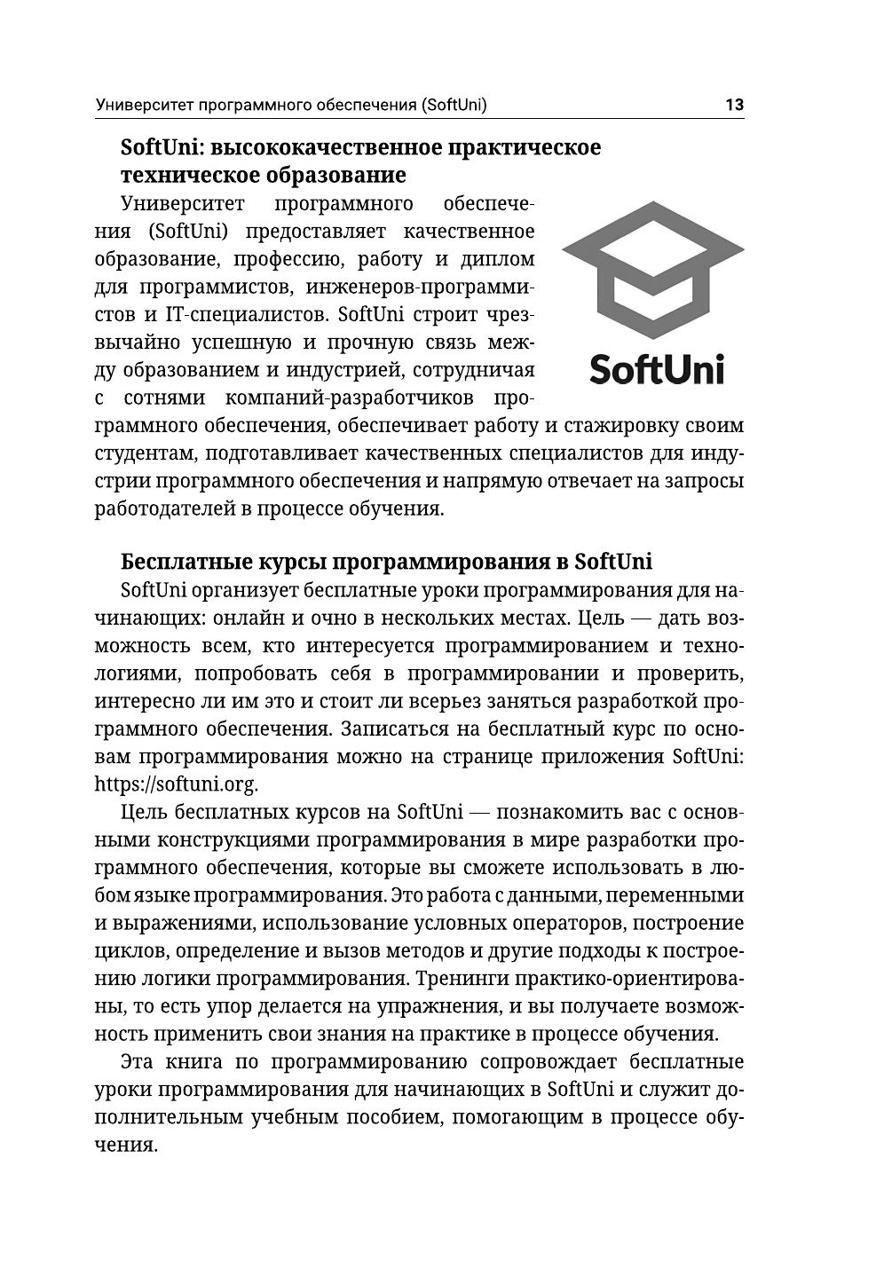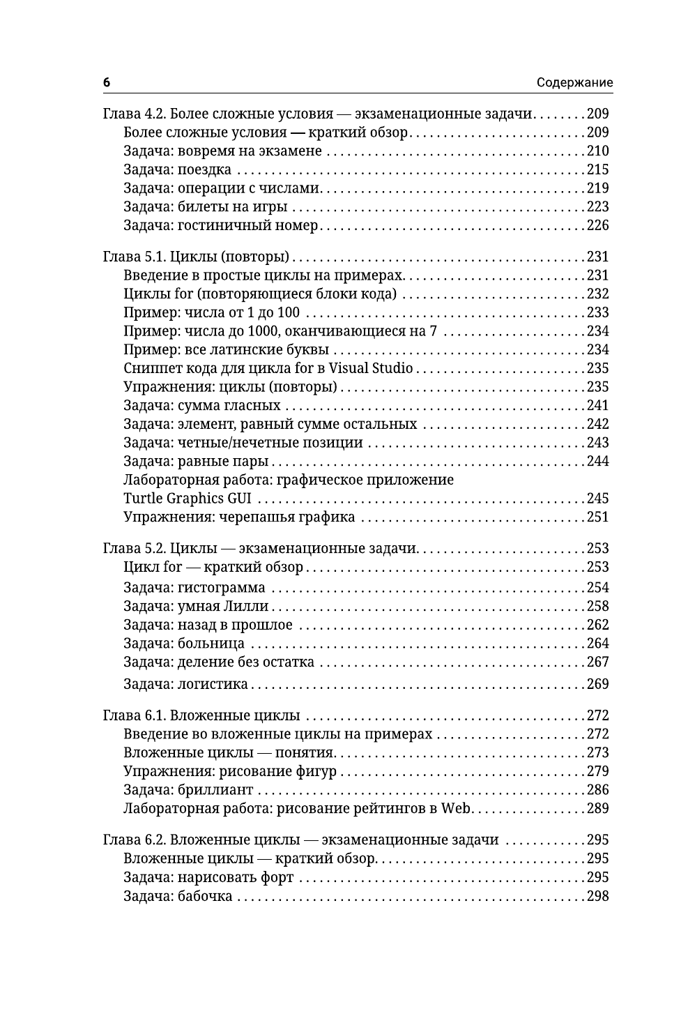 Книга «Основы программирования на C#» знакомит читателей с написанием программного кода в среде разработки (IDE) на начальном уровне, то есть дает базовые навыки программирования, обучает использованию переменных и данных, операторов и выражений, работе с консолью (считывание входных данных и вывод выходных данных), применению условных операторов (if, if-else, switch-case), циклов (for, while, do-while, foreach) и методов (объявление и вызов методов, передача параметров и возврат значений). Основной упор в издании сделан на практических упражнениях. С помощью небольшого количества текста и большого количества примеров кода и объяснений, дополненных множеством тщательно отобранных практических задач и судейской системой для мгновенной автоматической оценки написанного вами кода, эта книга поможет уверенно сделать первые шаги в программировании. Все примеры приводятся на C# — современном языке программирования общего назначения, который станет хорошим выбором для начинающих разработчиков программного обеспечения.