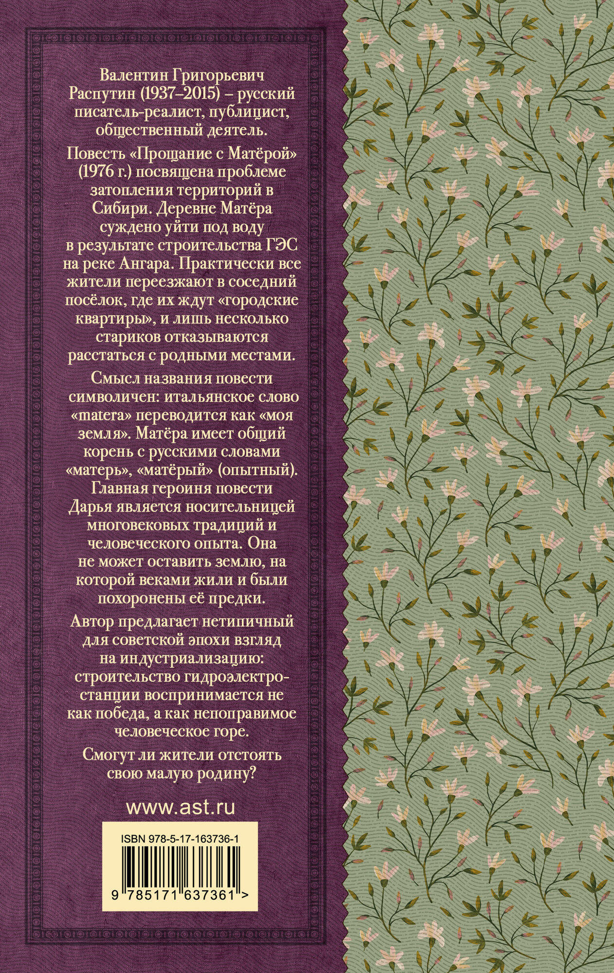 Валентин Григорьевич Распутин (1937–2015) – русский писатель-реалист, публицист, общественный деятель. Повесть «Прощание с Матёрой» (1976 г.) посвящена проблеме затопления территорий в Сибири. Деревне Матёра суждено уйти под воду в результате строительства ГЭС на реке Ангара. Практически все жители переезжают в соседний посёлок, где их ждут «городские квартиры», и лишь несколько стариков отказываются расстаться с родными местами. Смысл названия повести символичен: итальянское слово «matera» переводится как «моя земля». Матёра имеет общий корень с русскими словами «матерь», «матёрый» (опытный). Главная героиня повести Дарья является носительницей многовековых традиций и человеческого опыта. Она не может оставить землю, на которой веками жили и были похоронены её предки. Автор предлагает нетипичный для советской эпохи взгляд на индустриализацию: строительство гидроэлектростанции воспринимается не как победа, а как непоправимое человеческое горе. Смогут ли жители отстоять свою малую родину?