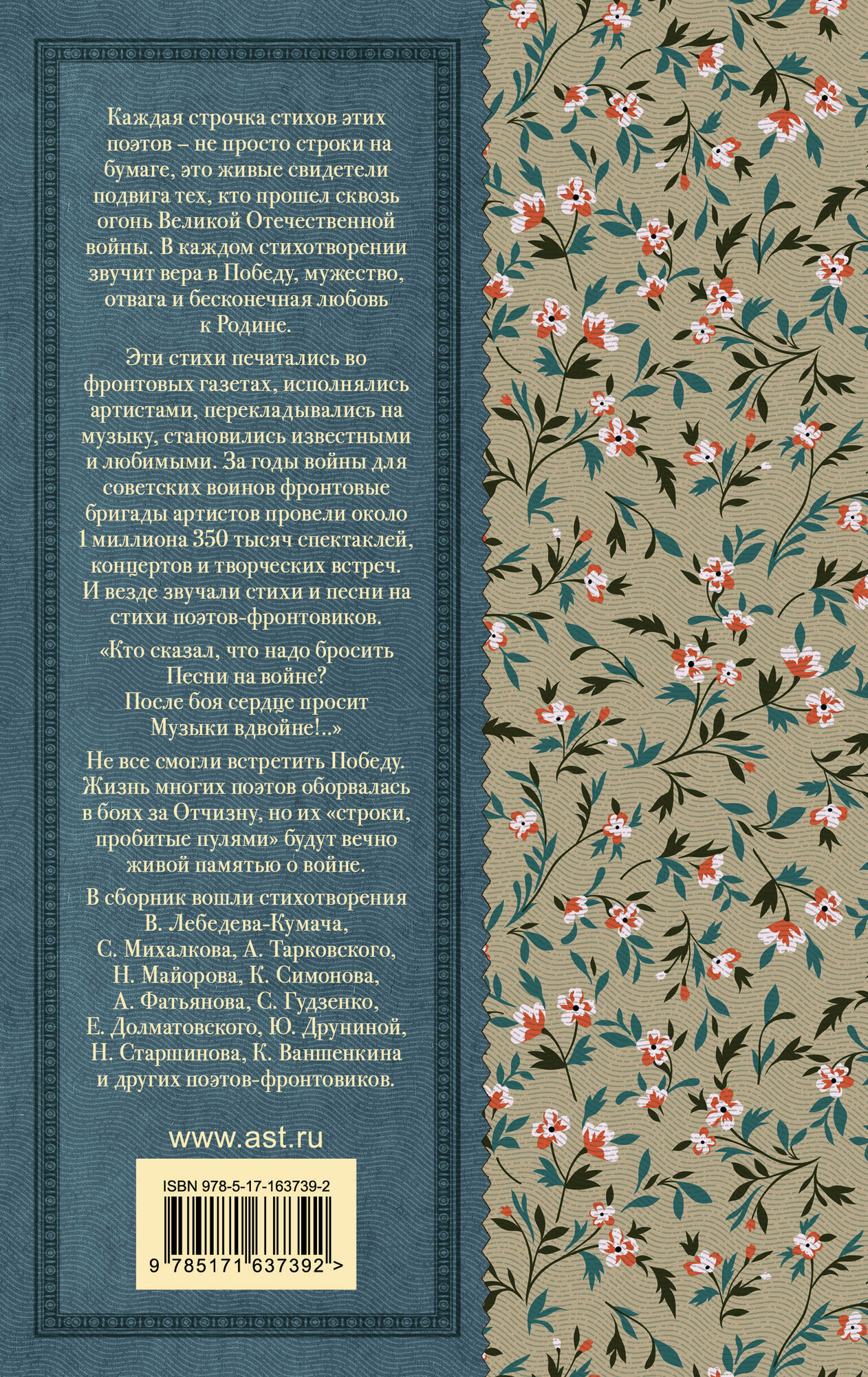 Каждая строчка стихов этих поэтов – не просто строки на бумаге, это живые свидетели подвига тех, кто прошел сквозь огонь Великой Отечественной войны. В каждом стихотворении звучит вера в Победу, мужество, отвага и бесконечная любовь к Родине. Эти стихи печатались во фронтовых газетах, исполнялись артистами, перекладывались на музыку, становились известными и любимыми. За годы войны для советских воинов фронтовые бригады артистов провели около 1 миллиона 350 тысяч спектаклей, концертов и творческих встреч. И везде звучали стихи и песни на стихи поэтов-фронтовиков. «Кто сказал, что надо бросить Песни на войне? После боя сердце просит Музыки вдвойне!..» Не все смогли встретить Победу. Жизнь многих поэтов оборвалась в боях за Отчизну, но их «строки, пробитые пулями», будут вечно живой памятью о войне. В сборник вошли стихотворения В. Лебедева-Кумача, С. Михалкова, А. Тарковского, Н. Майорова, К. Симонова, А. Фатьянова, С. Гудзенко, Е. Долматовского, Ю. Друниной, Н. Старшинова, К. Ваншенкина и других поэтов-фронтовиков.