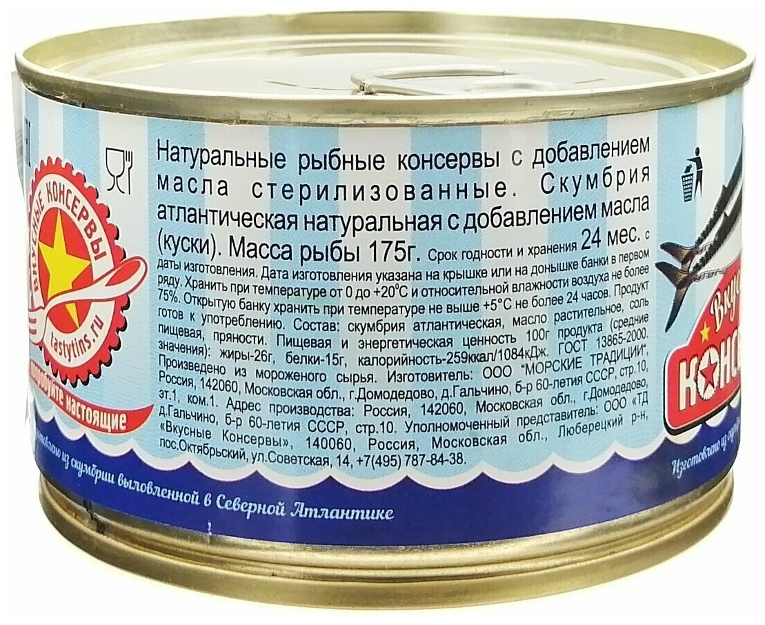 Скумбрия атлантическая Вкусные консервы, натуральная, с добавлением масла.