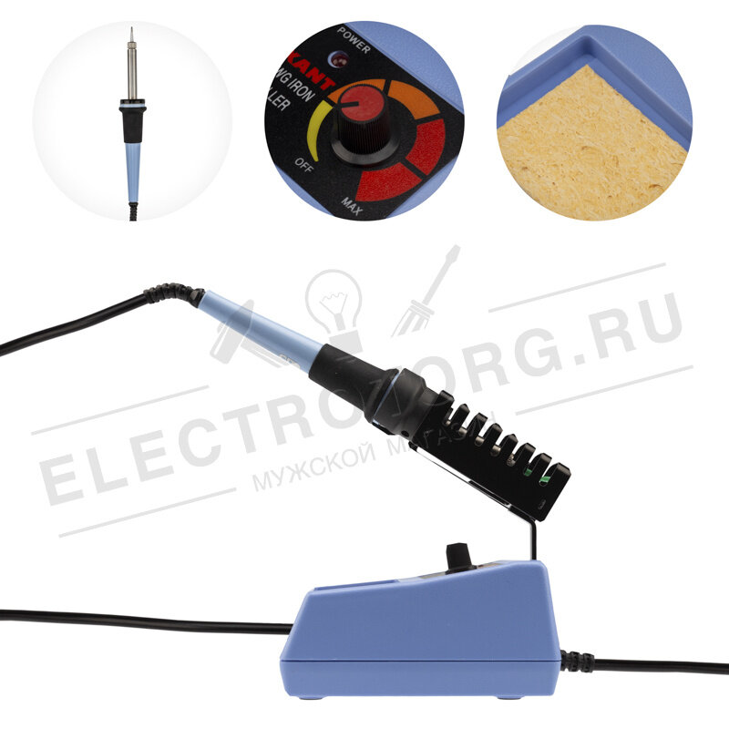 Станция комплектуется паяльником, держателем паяльника, а также губкой для очистки жала в ложементе. Паяльник оснащен нихромовым нагревателем и кнопкой с индикатором включения.