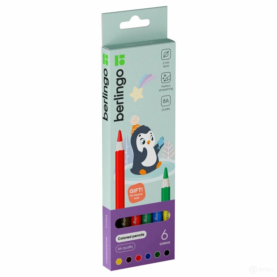 Набор из 6 цветов. Шестигранная утолщенная форма корпуса удобно ложится в руку ребенка. Указание цвета на каждом карандаше на английском языке. Поле для подписи имени владельца на каждом карандаше. Упаковка в плотную матовую картонную коробку со склеенным европодвесом.