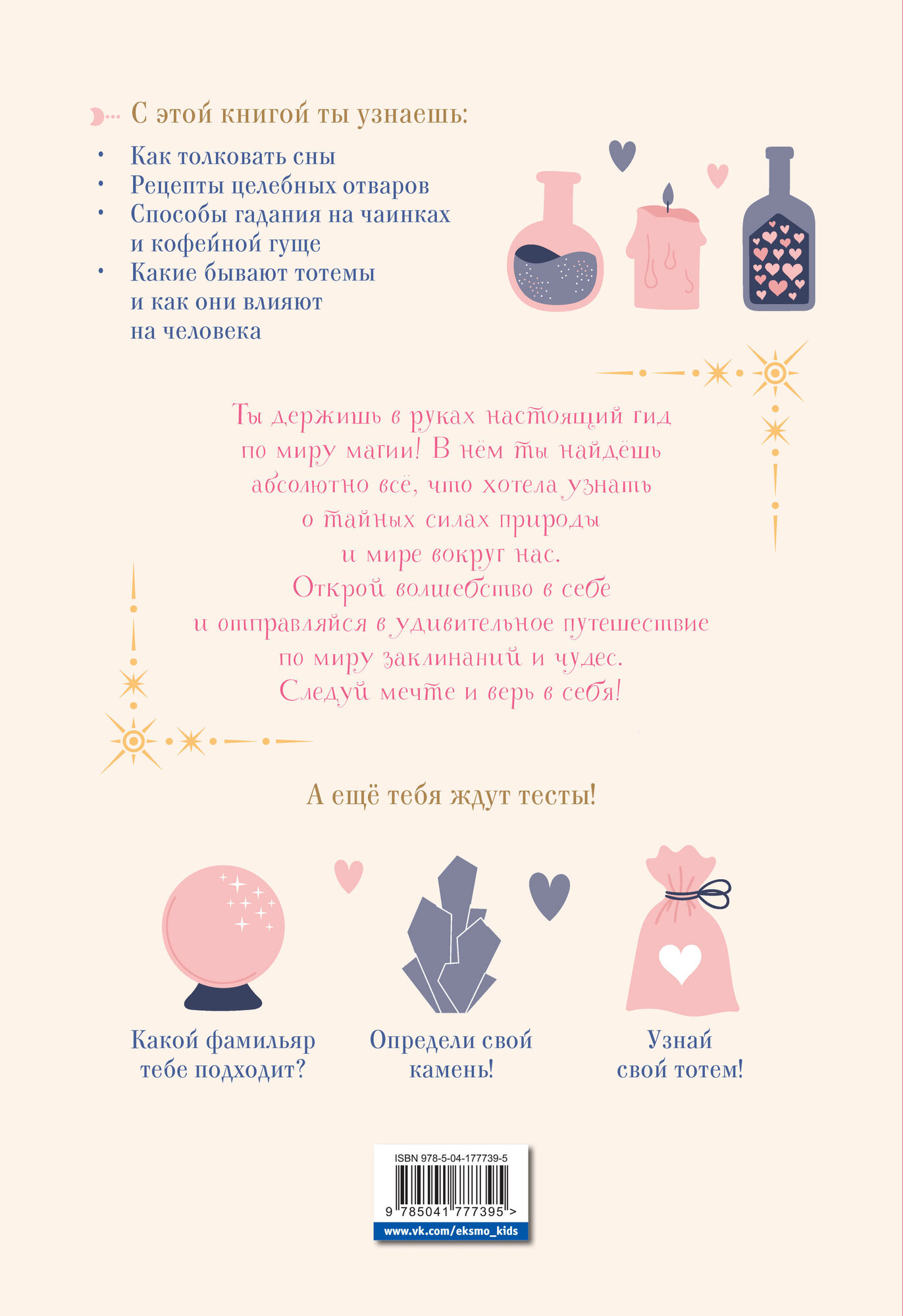 Тебя ждут рецепты целебных зелий и отваров, различные способы гадания, толкования снов, а также увлекательные тесты и полезные советы. Ты узнаешь о волшебных обрядах, таинствах и праздниках, о чудесных силах трав, растений, камней и кристаллов, научишься предсказывать будущее, используя магию звёзд и луны, создашь собственный талисман и найдёшь своё тотемное животное.