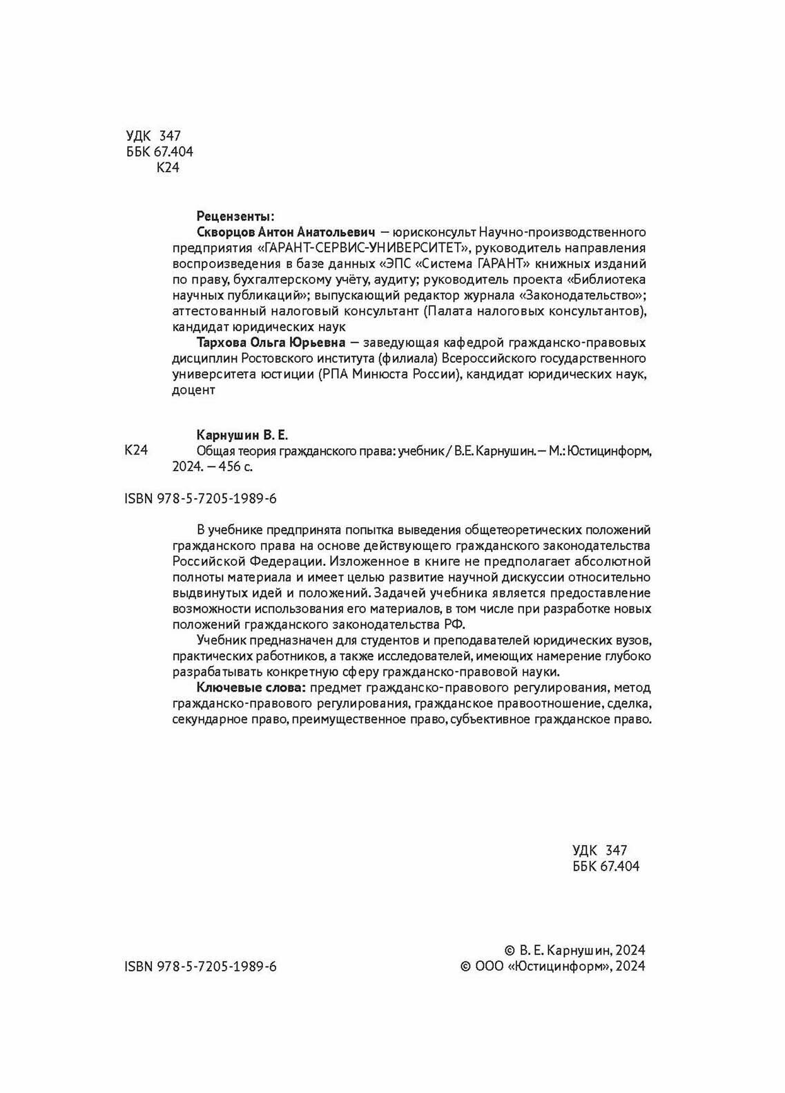 Общая теория гражданского права. Учебник (Вячеслав Евгеньевич Карнушин); Юстицинформ, 2024