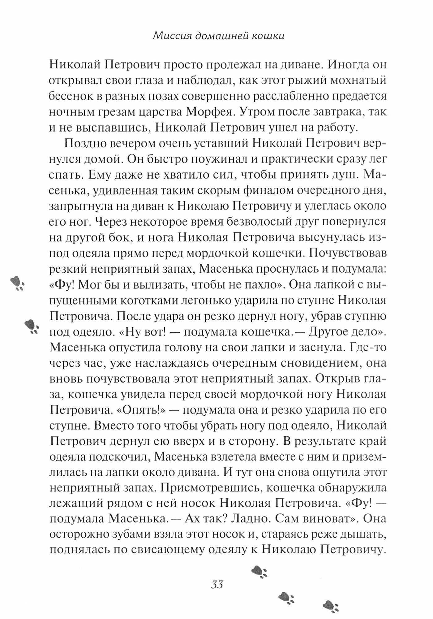 В этом произведении описывается жизнь домашней кошки, превратившейся волею благосклонной судьбы из бездомного котенка в любимого питомца. С первых дней жизни кошечка проведет вас по пути, полному приключений, радостных и смешных моментов, переживаний и опасностей. Через множество встреч с людьми и другими животными, включая попугаев, вы сможете проследить, как героиня познает окружающий мир. Посредством анализа мыслей и действий кошечка выберет то основное, что укажет ее собственное место в этой жизни. Большинство поступков и решений, описанных в произведении и казавшихся на первый взгляд неосознанными, в конце концов, обретут смысл и определят миссию домашней кошки. Также вы узнаете, что ей требуется для счастливой и долгой жизни. Произведение дает вам шанс взглянуть на мир глазами своего питомца.