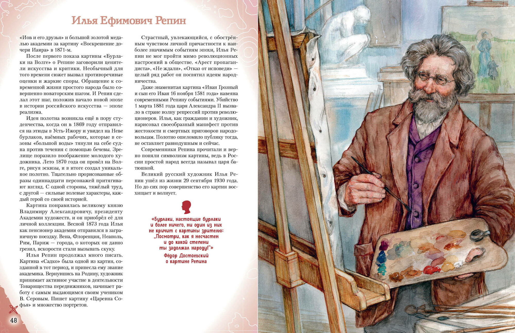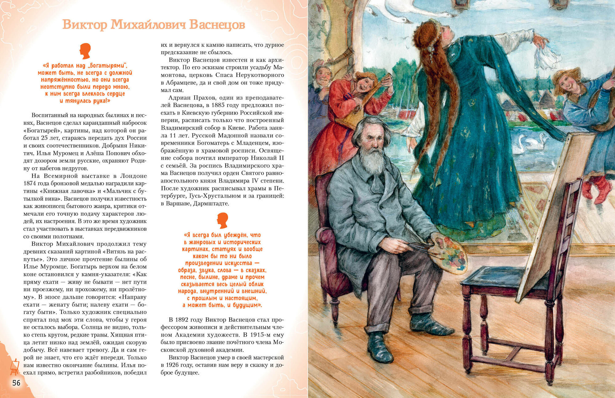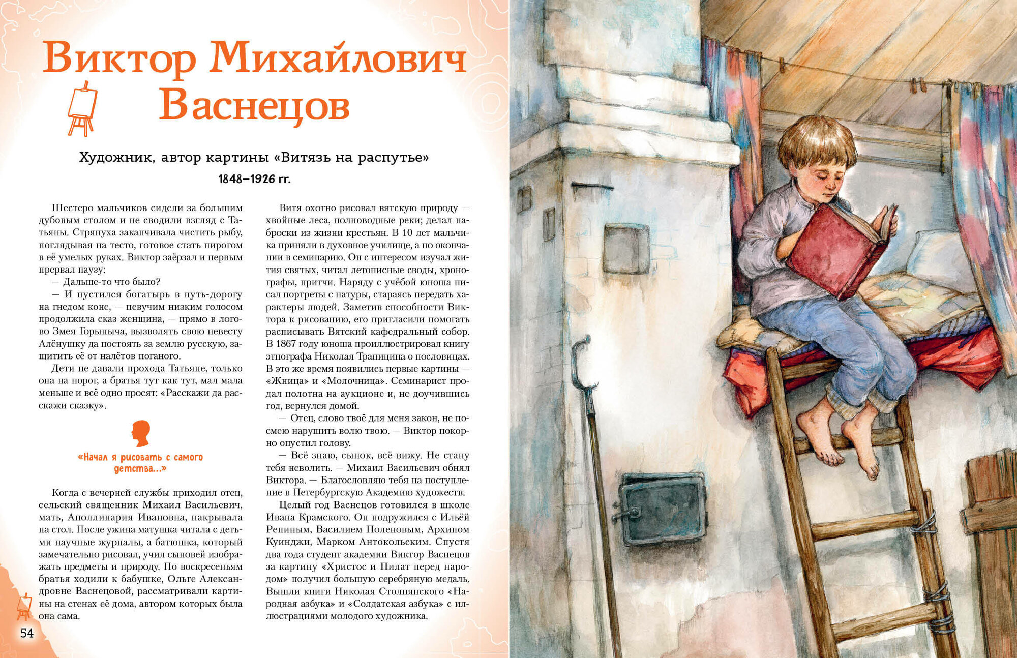 От книжки просто в восторге я и моя дочь. Купил и очень доволен этим, сам люблю книги и дочь приучаю, а тут такая находка. Да и вообще тема художников России и художников в целом, оставалась для меня не завершённой. Вместе читаем, взахлёб. Написана книга простым понятным языком, для любого, взрослого, ребенка. Очень советую, классное время препровождения с семьёй.