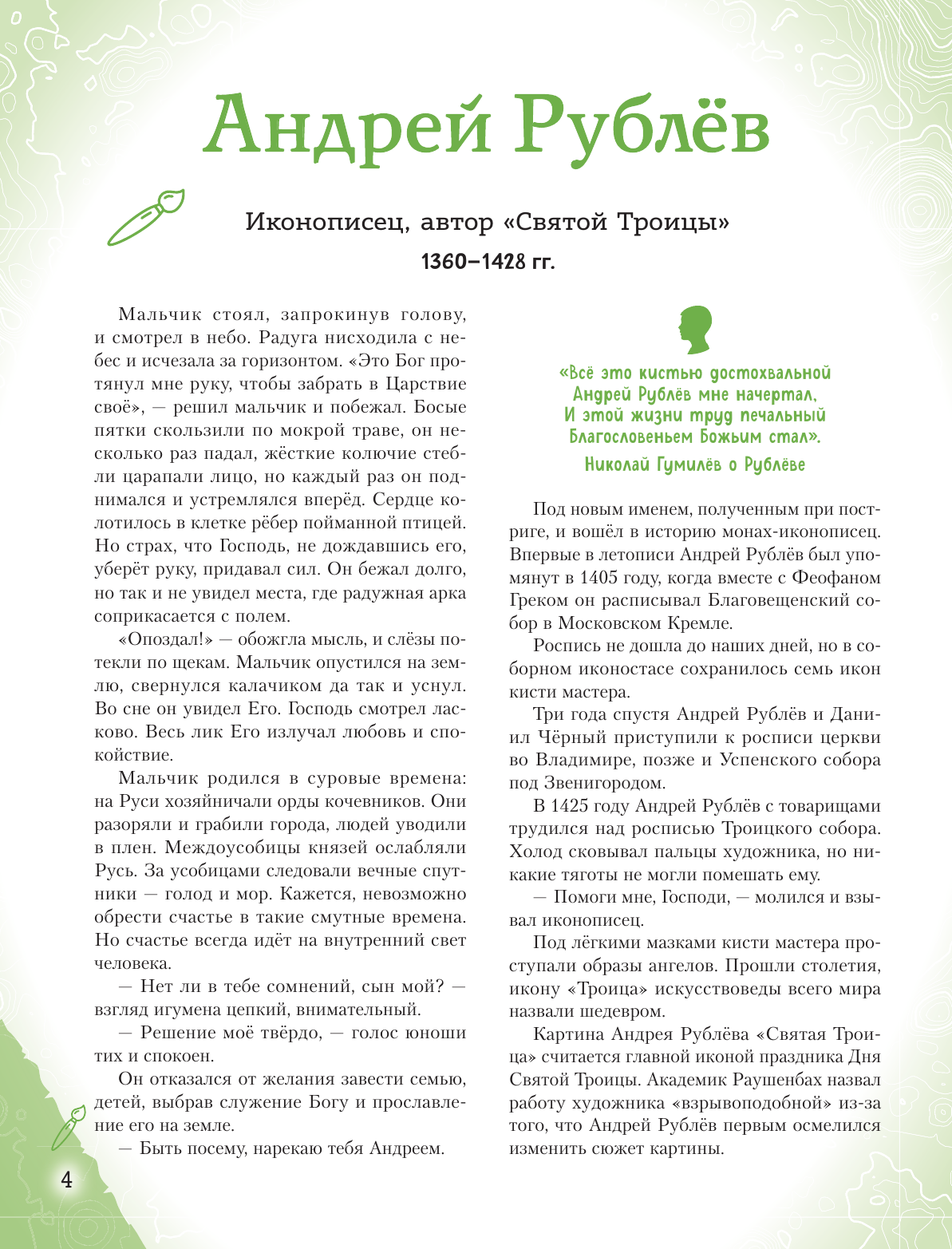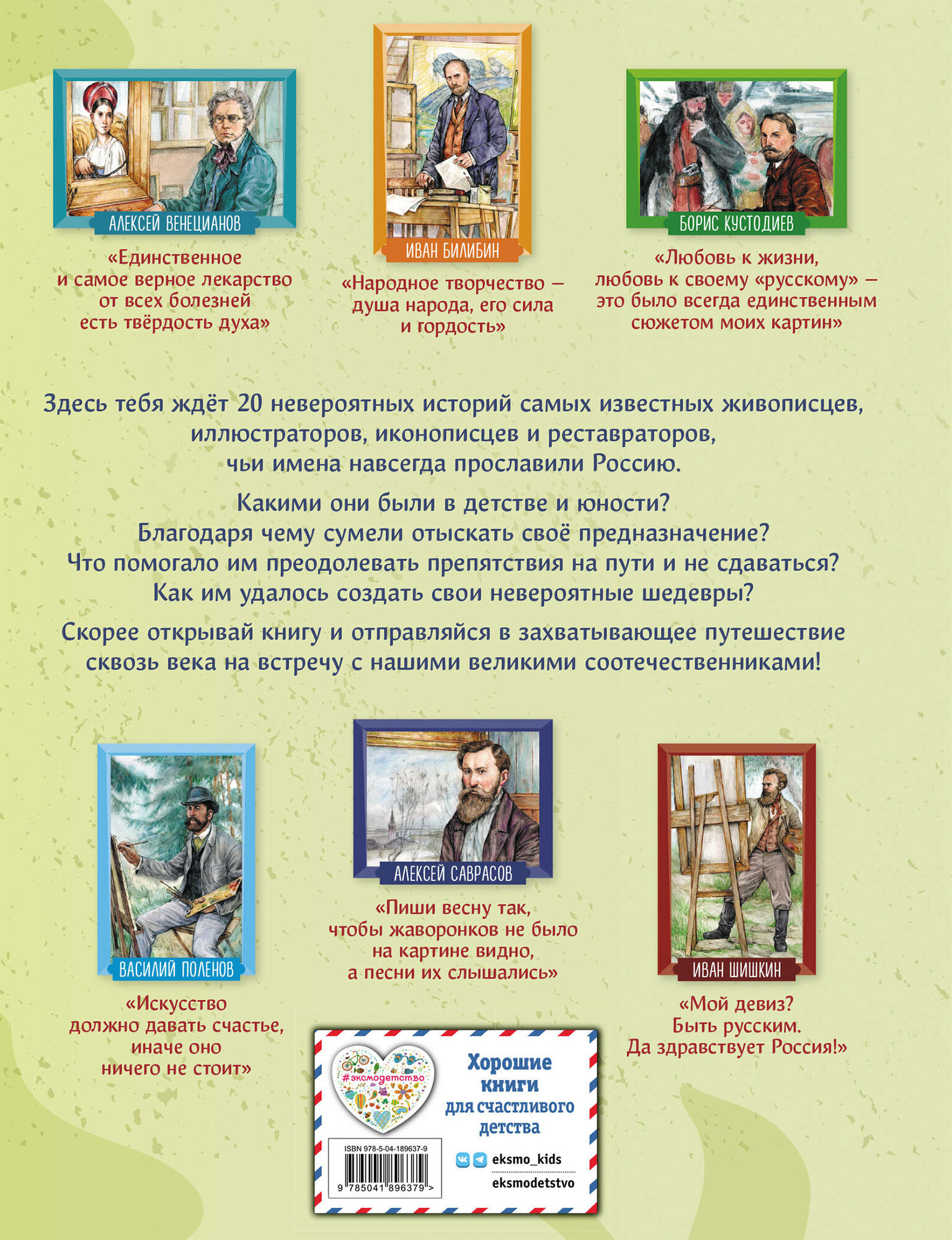 Эта книга патриотической серии "Великие люди великой страны" рассказывает о двадцати наших знаменитых соотечественниках - живописцах, иллюстраторах, портретистах, иконописцах, реставраторах и скульпторах, чьи имена навсегда останутся в истории России. - Какой художник писал картину более 20 лет? - Кто стал самым молодым академиком за всю историю Академии художеств? - Чьи полотна считаются вершиной искусства и входят в золотой фонд русской живописи? Захватывающие сюжеты в жанре нарративного нонфикшена, исторических "детективов" и "боевиков"! В каждом рассказе - вдохновляющая читателей на собственные свершения история успеха, невероятный пример силы воли и стойкости характера! Динамичные, запоминающиеся, современные, яркие иллюстрации созданы специально для этой книги! Издание предназначено для среднего школьного возраста, однако будет интересно и взрослым, а также станет неповторимым подарком по любому поводу для всех, кто любит Россию и гордится ею. Читайте всей семьей и узнавайте все самое интересное о великих людях нашей страны!