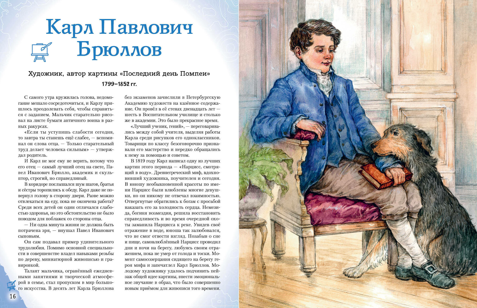 Моя дочка учится в художественной школе. Увлекается художниками, у нас большая коллекция книг с биографиями художников и их работами. Но те издания рассчитаны на взрослых, эта книга рассчитана на детей, здесь очень яркая подача, яркие красивые иллюстрации, удобный для чтения шрифт. Моя девочка прочитала эту книгу за неделю , просит продолжения. Плюсов много, подойдёт в подарок.