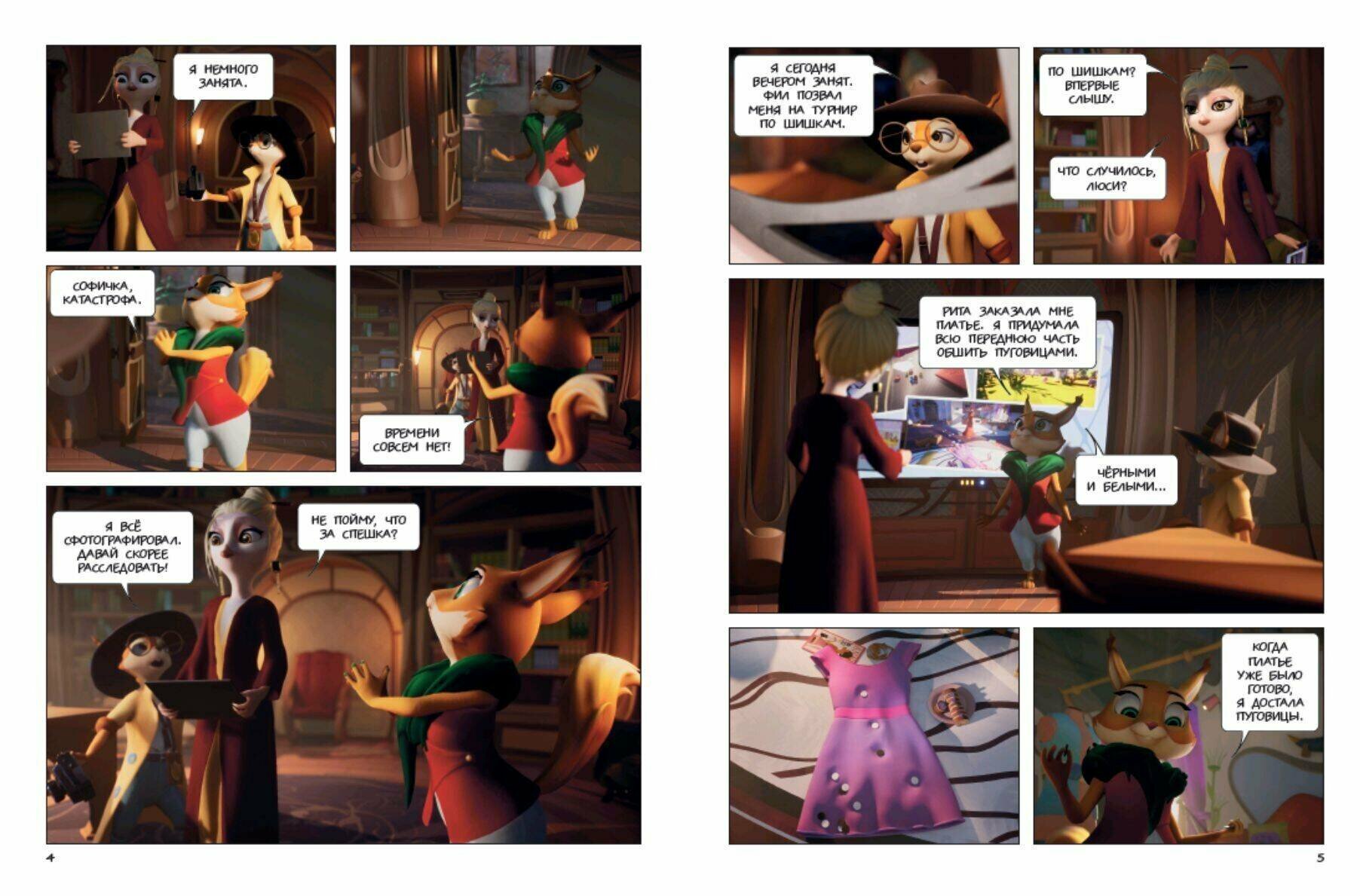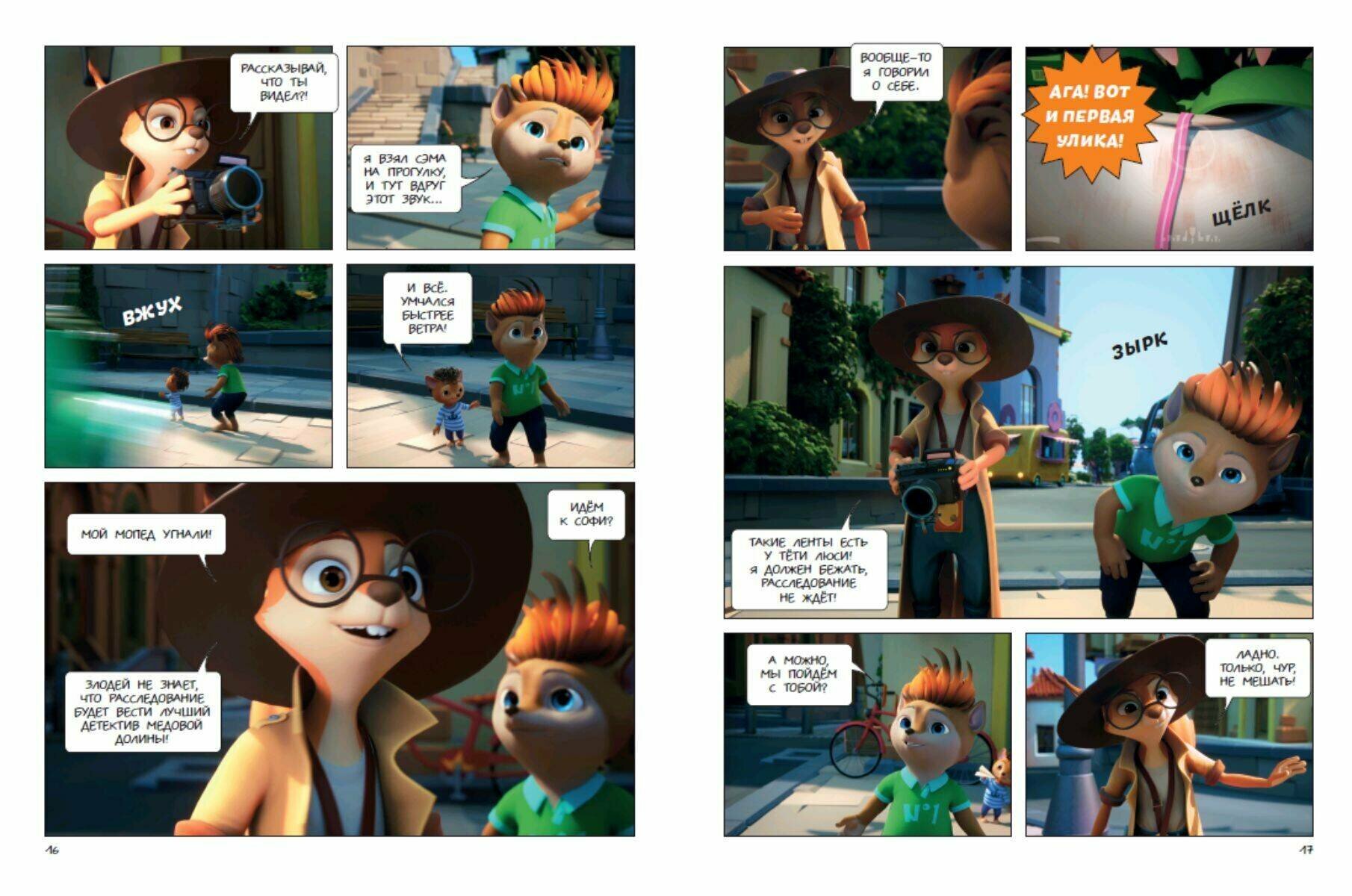 5 детективных историй в формате комикса для фанатов мультсериала "Тайны Медовой Долины" от студии "Союзмультфильм". Детектив Софи расследует любое преступление, будь то кража пуговиц, таинственная пропажа мопеда, испорченные манекены или исчезнувшая коробка. Ее помощник Чинк не слишком внимателен и часто попадает в неприятности, но крайне серьезно относится к своим обязанностям. Бельчонок мечтает о звании младшего детектива. С каждым раскрытым делом Чинк становится опытнее и самостоятельнее. Благодаря поддержке и наставлениям Софи он осваивает главные принципы расследования: поиск улик и мотива, опрос подозреваемых, организация засады и проведение следственного эксперимента. Вместе с Чинком вы пройдете путь от несмышленого ученика до независимого сыщика. Этот увлекательный комикс-детектив учит не сдаваться и добиваться поставленных целей.