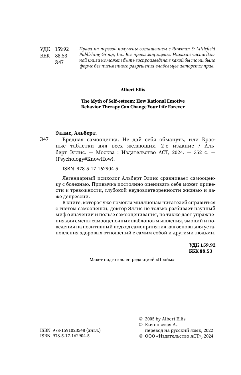Вредная самооценка. Не дай себя обмануть или Красные таблетки для всех желающих. 2-е издание (Альберт Эллис); АСТ, 2024