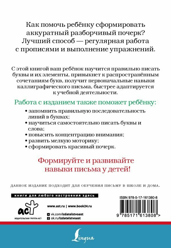 Издание содержит строчные и прописные буквы с точкой для начала письма и стрелками, которые показывают направление линий. Это способствует формированию разборчивого почерка и выработке уверенности при письме.
