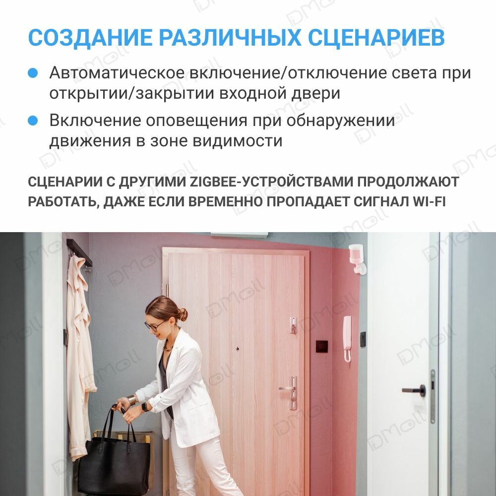 Датчик движения MOES Zigbee Infrared Human Sensor — устройство для мониторинга движения в доме или на улице, обеспечивающее безопасность. Прибор позволяет следить за обстановкой в режиме реального времени: при обнаружении движения на смартфон поступит уведомление. С помощью беспроводного подключения датчик может взаимодействовать с другими интеллектуальными устройствами и становиться частью умных сценариев. Например, при открытии/закрытии двери датчик будет включать/выключать свет. Работает по протоколу Zigbee 3.0 только при наличии хаба. Устройство продолжит работу и выполнение сценариев с другими устройствами, работающими на протоколе Zigbee, даже в случае, если Wi-Fi сигнал пропадет. Широкий угол обзора 120-150° позволяет обнаруживать движение на расстоянии 3-7 м. Управлять настройками можно через приложение Smart Life, работает с голосовыми помощниками, в том числе с Алисой. Доступно прямое подключение к Умному дому Яндекса при наличии Яндекс Станции 2 с Zigbee/Миди/Макс/Дуо Макс/Хаба Яндекса (без дополнительного хаба от MOES). Питание от одной батарейки CR2450. Диапазон рабочей температуры от -10 до 50°С. Поворотная ножка для установки в комплекте. Высококачественный пластик подходит для использования в суровых климатических условиях. Компактный корпус не занимает много места и устанавливается на любую поверхность.