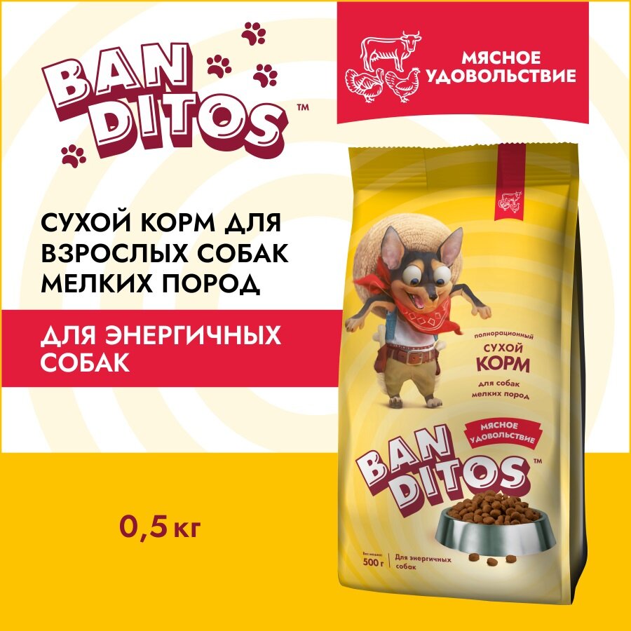 Сухой корм для взрослых собак мелких пород BANDITOS с курицей говядиной и индейкой 500 г