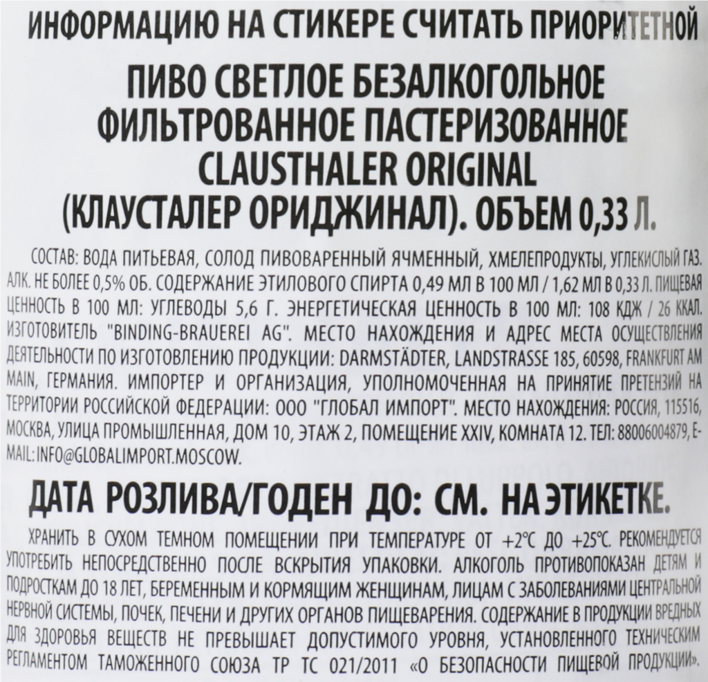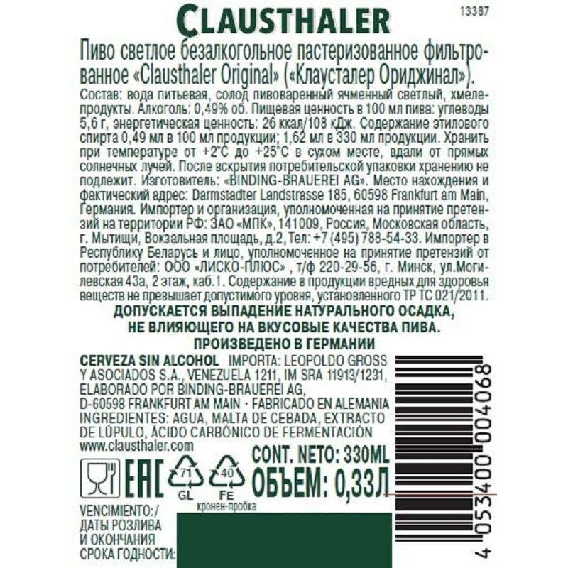 Clausthaler Original безалкогольное пиво премиум-класса. Вкус пива приятный, освежающий, с гладкой текстурой, горьковатыми хмелевыми нотками и сладкими солодовыми оттенками, нюансами зерна, хлеба, винограда, длительным послевкусием с хмелевой горчинкой. Алкоголь противопоказан детям и подросткам до 18 лет, беременным и кормящим женщинам, лицам с заболеваниями центральной нервной системы, почек, печени и других органов пищеварения. Чрезмерное употребление алкогольной продукции вредит здоровью человека.
