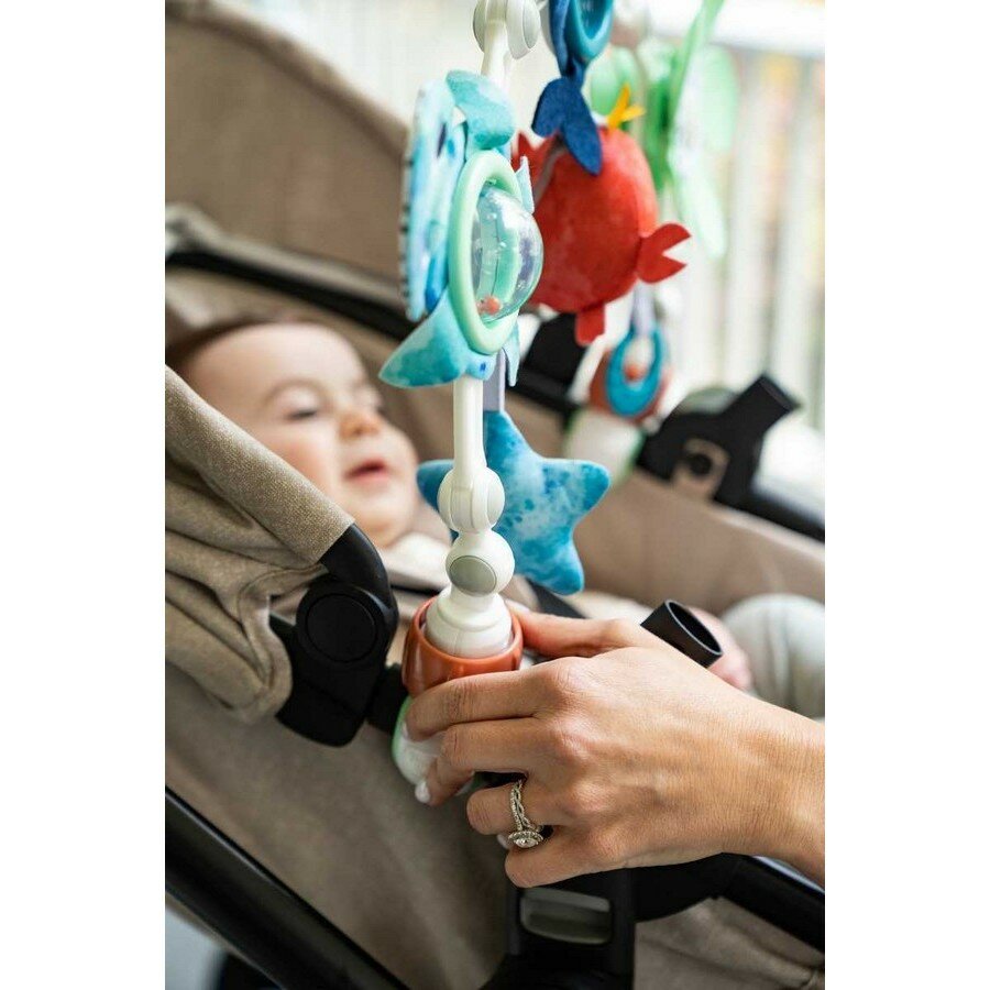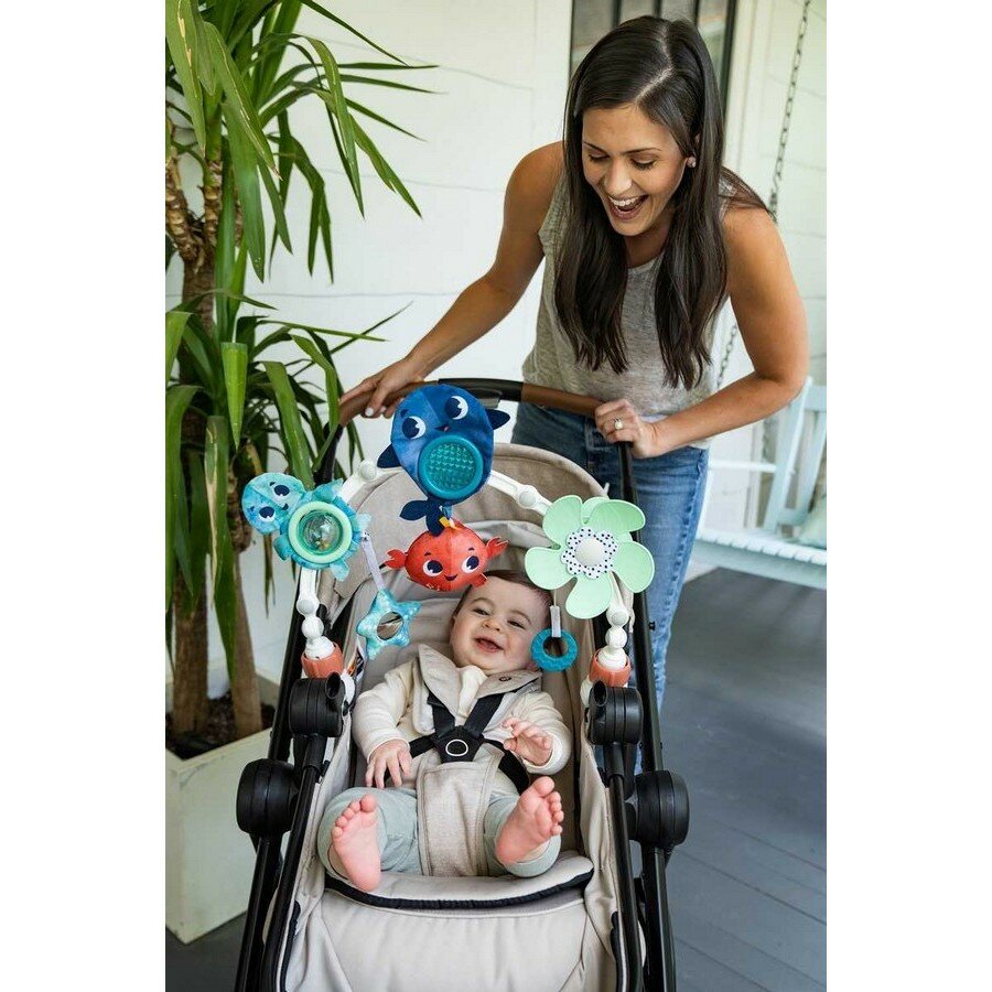 Дуга с подвесными развивающими игрушками подходит к большинству колясок, детских автокресел и колыбелей. Она выполнена преимущественно в сине-голубых цветах и посвящена морским обитателям.
