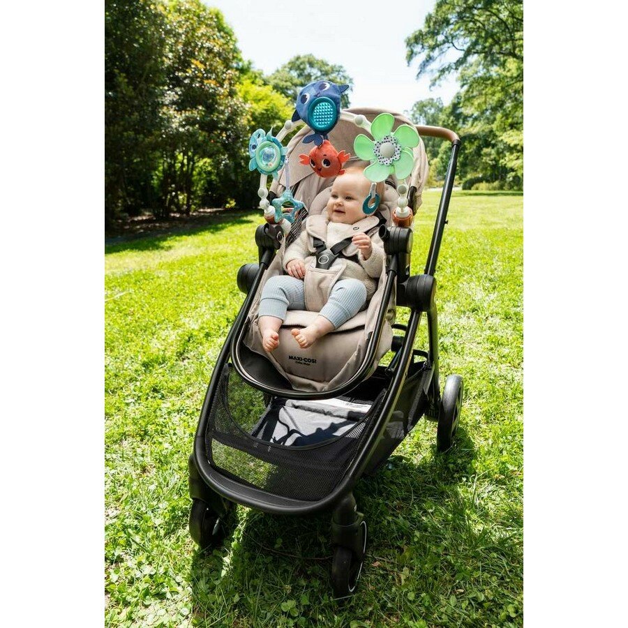В комплект входят следующие подвесные игрушки: Погремушка с шариками и шуршащими тканевыми элементами, мягкое безопасное зеркальце в виде морской звезды, призма-китённок, подвесная мягкая игрушка-крабик с шуршащими деталями, интерактивной цветочек-пропеллер и съемное кольцо-прорезыватель.
