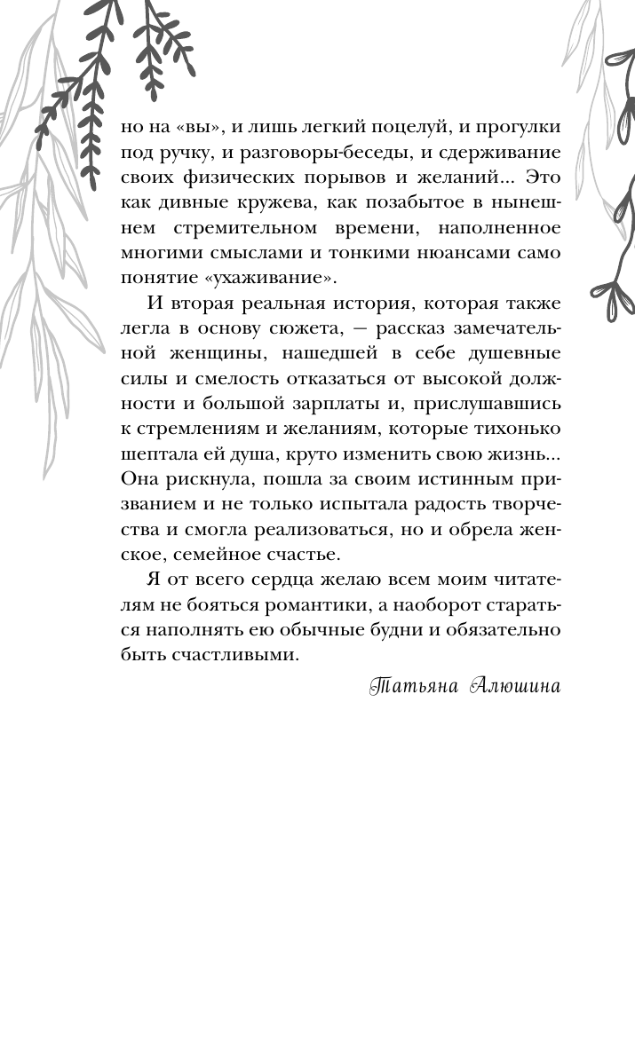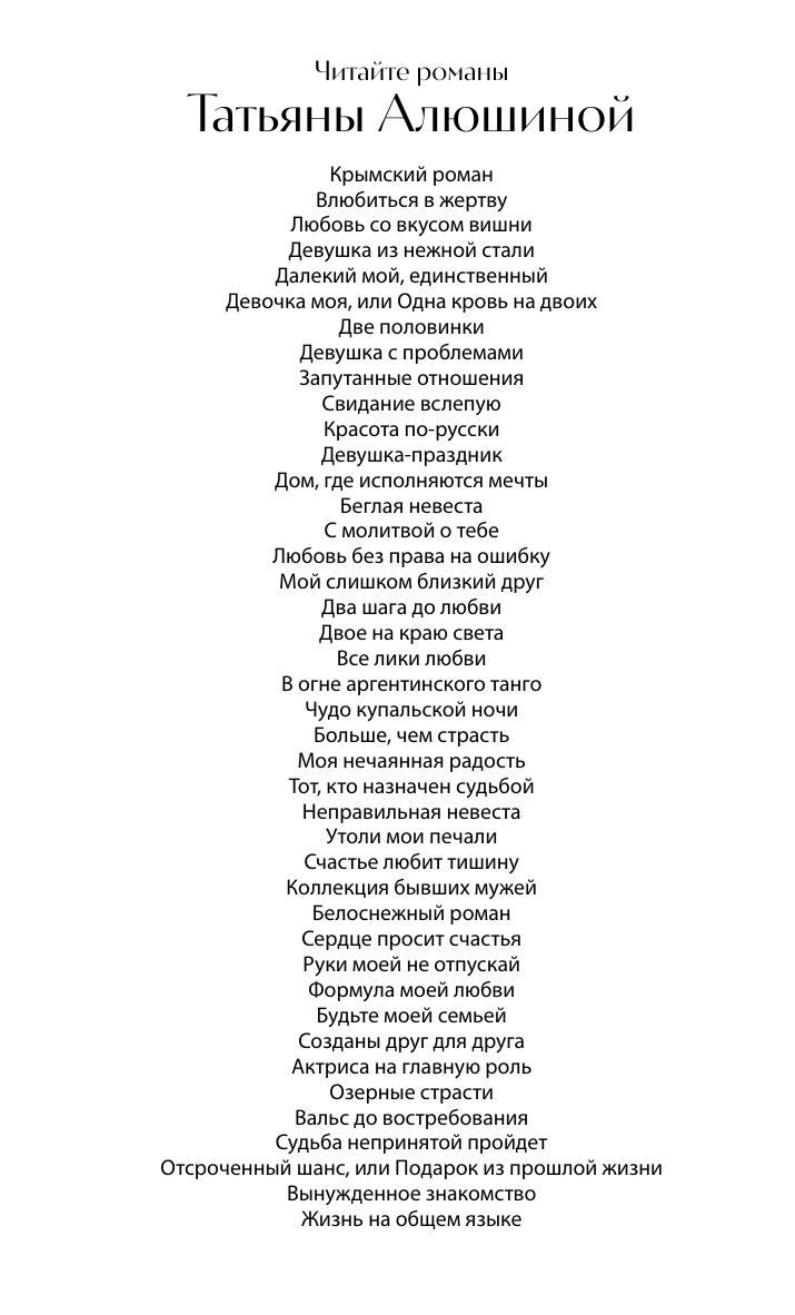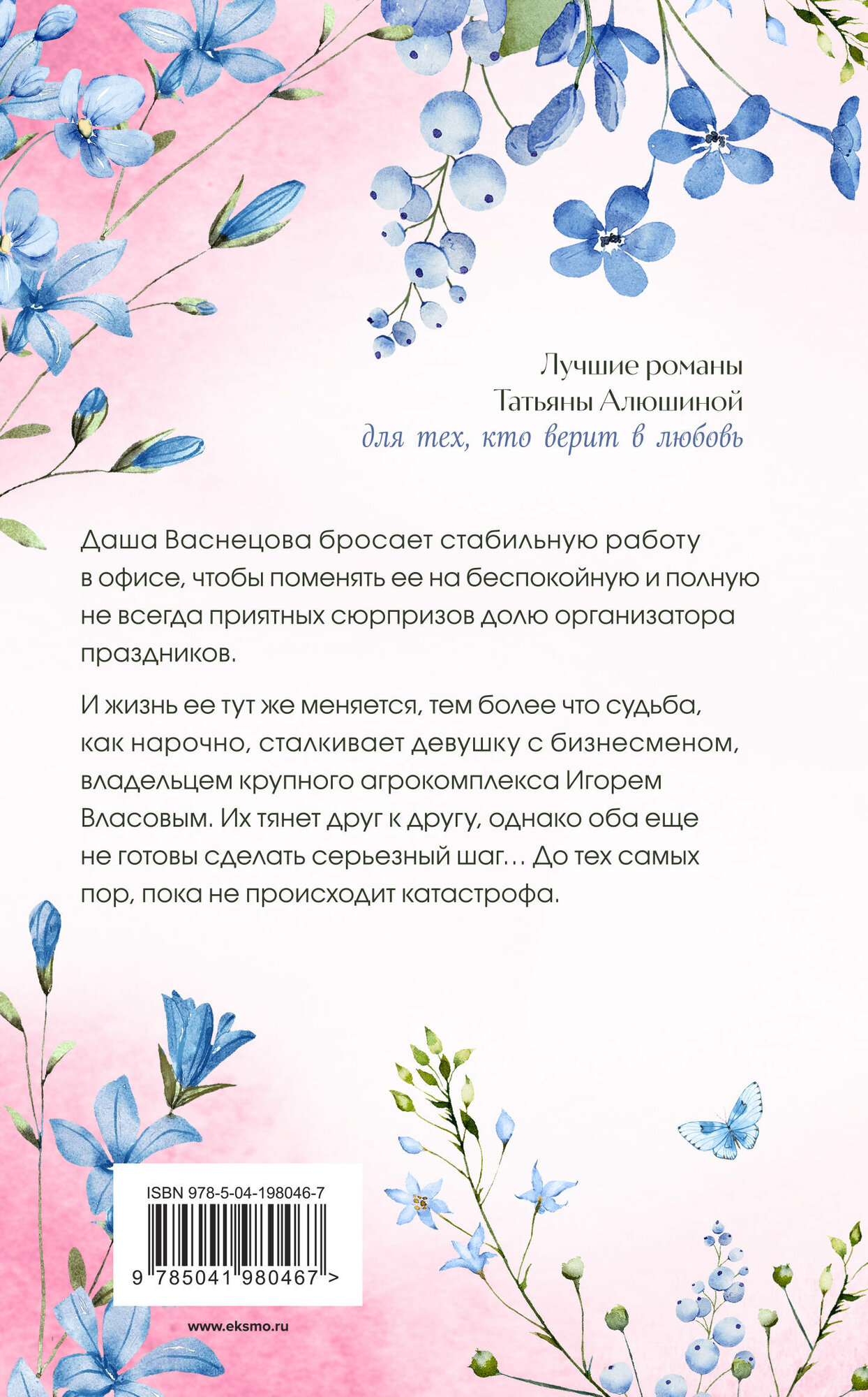 Романы Татьяны Алюшиной давно заслужили признание читательниц по всей стране, а суммарный тираж ее книг насчитывает более пяти миллионов! Захватывающие сюжеты, незабываемые чувства и подлинная страсть - ее книги читаются на одном дыхании и снова помогают поверить: счастье есть! Даша Васнецова бросает стабильную работу в офисе, чтобы поменять ее на беспокойную и полную не всегда приятных сюрпризов долю организатора праздников. И жизнь ее тут же меняется, тем более что судьба, как нарочно, сталкивает девушку с бизнесменом, владельцем крупного агрокомплекса Игорем Власовым. Их тянет друг к другу, однако оба еще не готовы сделать серьезный шаг. До тех самых пор, пока не происходит катастрофа.