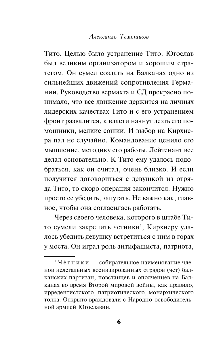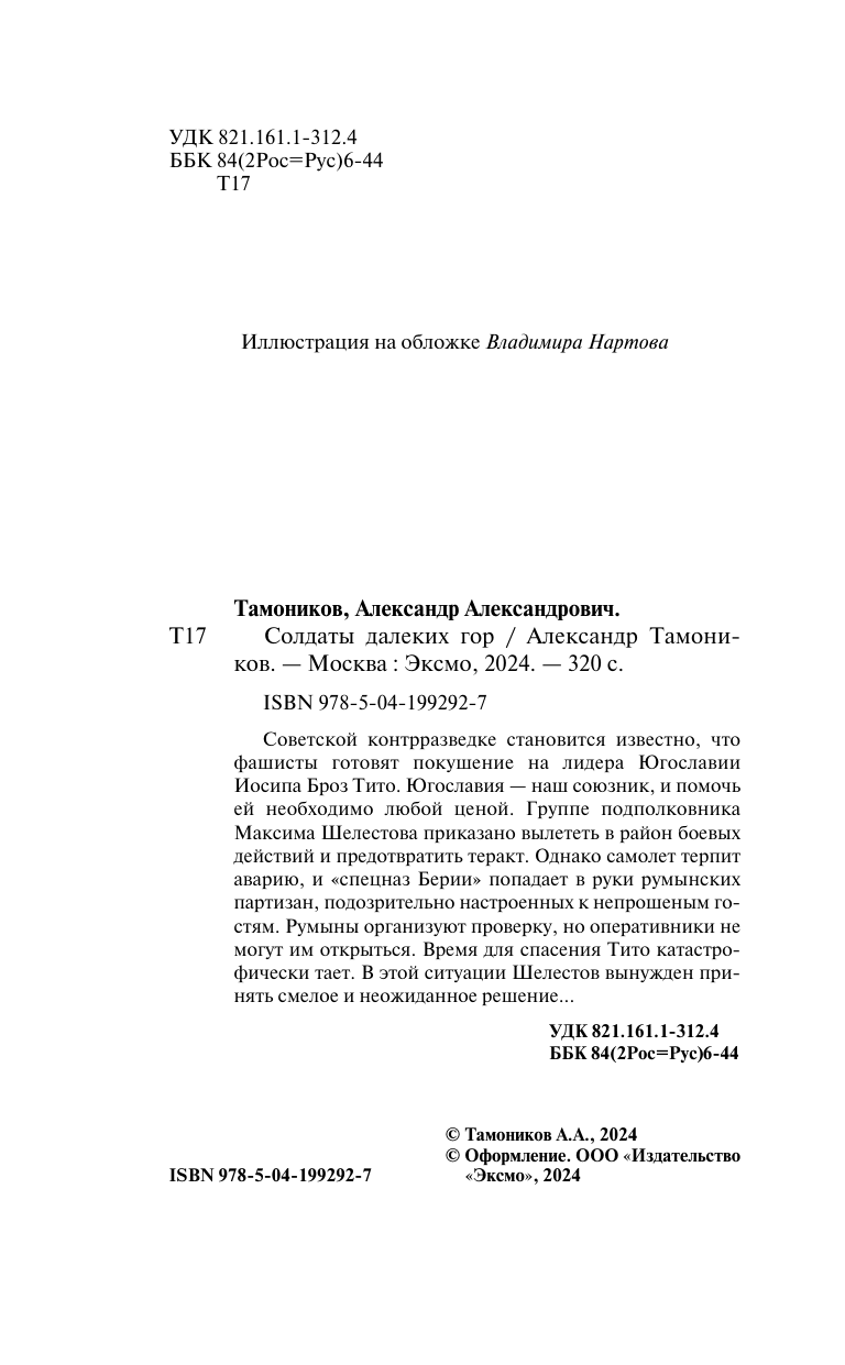Роман о военном времени, о сложных судьбах и опасной работе неизвестных героев, вошедших в ударный состав "спецназа Берии". Советской контрразведке становится известно, что фашисты готовят покушение на лидера Югославии Иосипа Броз Тито. Югославия - наш союзник, и помочь ей необходимо любой ценой. Группе подполковника Максима Шелестова приказано вылететь в район боевых действий и предотвратить теракт. Однако самолет терпит аварию, и "спецназ Берии" попадает в руки румынских партизан, подозрительно настроенных к непрошеным гостям. Румыны организуют проверку, но оперативники не могут им открыться. Время для спасения Тито катастрофически тает. В этой ситуации Шелестов вынужден принять смелое и неожиданное решение. "Эта серия хороша тем, что в ней проведена верная главная мысль: в НКВД Лаврентия Берии умели верить людям, потому что им умел верить сам нарком. История группы майора Шелестова сходна с реальной историей крупного агента абвера, бывшего штабс-капитана царской армии Нелидова, попавшего на Лубянку в сентябре 1939 года. Тем более вероятными выглядят на фоне истории Нелидова приключения Максима Шелестова и его товарищей, описанные в этом романе". - С. Кремлев Общий тираж книг А. Тамоникова - более 10 миллионов экземпляров.