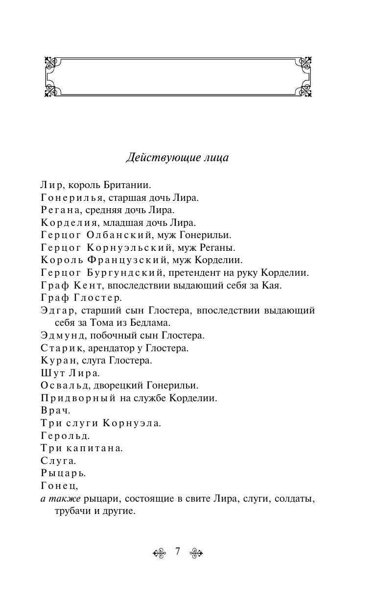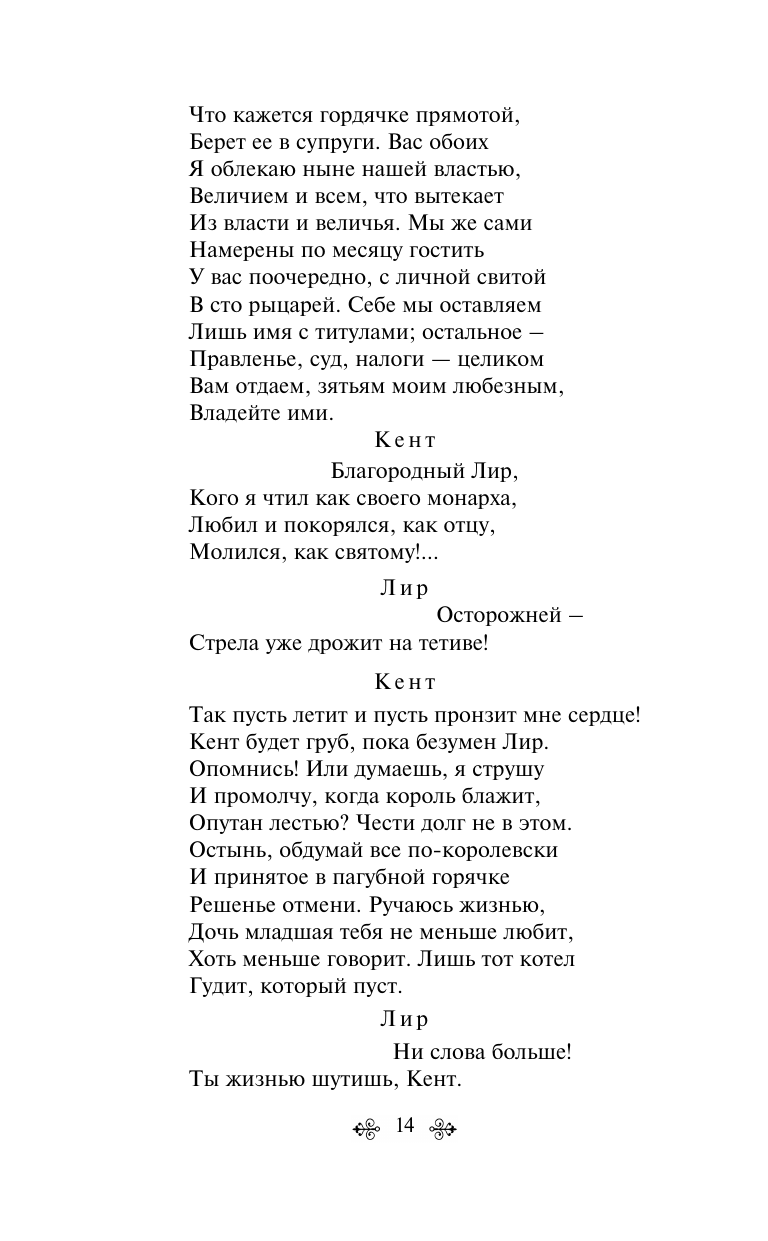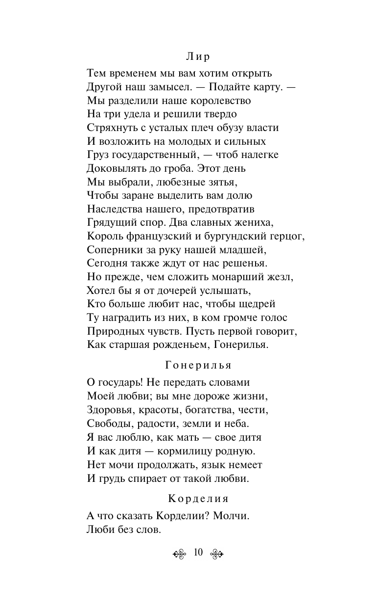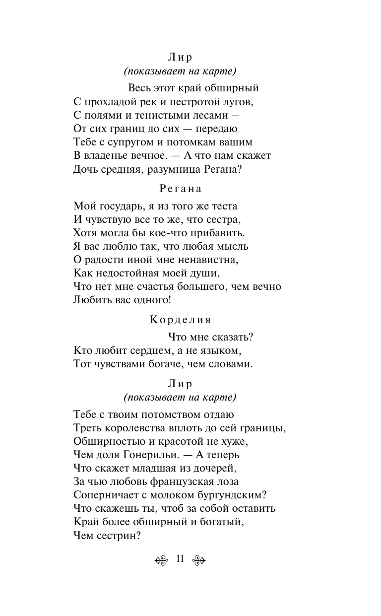 Проходят столетия, но пьесы великого английского драматурга Уильяма Шекспира продолжают привлекать внимание читателей и зрителей. Секрет бессмертия его произведений не только в образности языка и яркости персонажей. Стержнем шекспировских пьес являются сильные человеческие чувства и страсти. Движимые любовью, жаждой мести, тщеславием или завистью, герои Шекспира не оставляют нас равнодушными, потому что все эти чувства и страсти - вечны. И еще одна из главных тем - источник любой страсти и любого порока - своеволие и необоримая потребность "взять свое". Страшный девиз "каждому свое" начертан над входом в созданный Шекспиром ад больших и малых, но всегда смертоносных страстей. "Король Лир", "Буря" принадлежат позднему периоду творчества Уильяма Шекспира; в обеих пьесах главный герой - стареющий властитель, а тема - расставание с властью. Трагедию "Король Лир" многие называют величайшим из всех творений Шекспира. Блок писал: "Трагедии Ромео, Отелло, даже Макбета и Гамлета могут показаться детскими рядом с этой. Здесь простейшим и всем понятным языком говорится о самом тайном, о чем и говорить страшно. ". К самым успешным и популярным на сцене пьесам Шекспира относят и "Бурю"; ее жанр обычно определяют как романтическая сказка, хотя фактически это трагикомедия. Это - последняя пьеса Шекспира, написанная без соавторов, его прощание с театром. "Макбет" тоже о власти, правда, продлившейся не долго. Три загадочных пророчества сбываются, Макбет захватывает трон Шотландии. Это одна из самых мрачных и жестоких трагедий Шекспира.