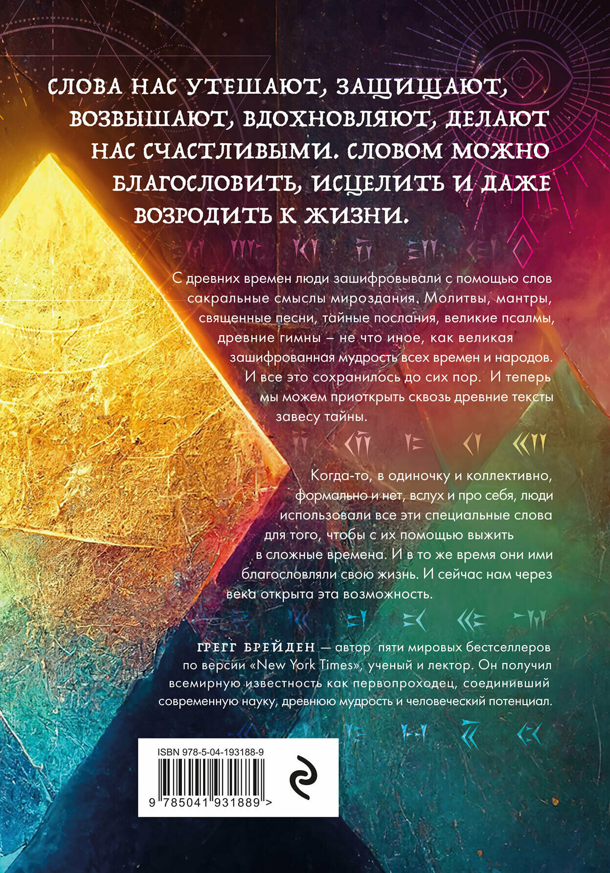 С древних времен люди зашифровывали с помощью слов сакральные смыслы мироздания. И теперь мы можем приоткрыть сквозь древние тексты завесу тайны. Когда-то, в одиночку и коллективно, формально и нет, вслух и про себя, люди использовали все эти специальные слова и тексты для того, чтобы с их помощью выжить в сложные времена. И в то же время они ими благословляли свою жизнь. И сейчас нам через века тоже открыта эта возможность. Грегг Брейден - автор пяти мировых бестселлеров по духовному развитию, ученый и лектор. Он получил всемирную известность как первопроходец, соединивший современную науку, древнюю мудрость и человеческий потенциал.