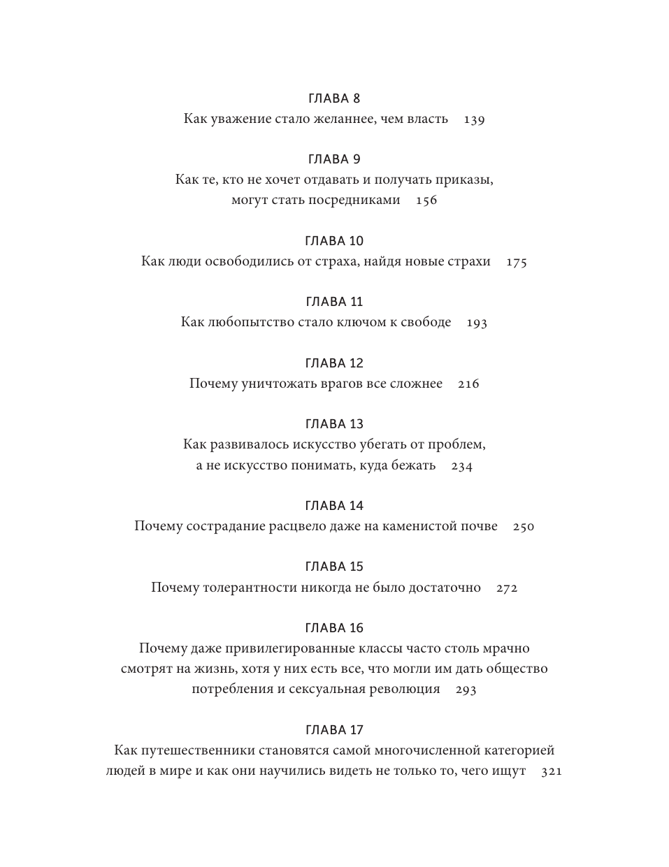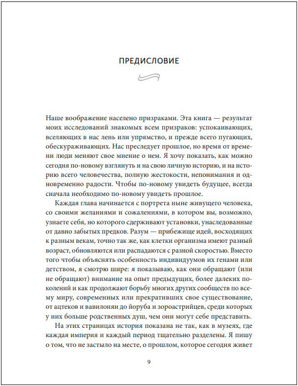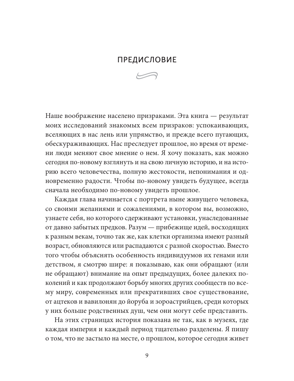 Каждая из глав начинается с портрета ныне живущего человека, со своими желаниями и сожалениями, в котором вы, возможно, узнаете себя, но которого сдерживают установки, унаследованные от давно забытых предков. Вместо того, чтобы объяснять особенность индивидуумов их генами или детством, я смотрю шире: я показываю, как они обращают (или не обращают) внимание на опыт предыдущих, более далеких поколений, и как продолжают борьбу многих других сообществ по всему миру, действующих или вымерших, от ацтеков и вавилонян до йоруба и зороастрийцев, среди которых у них больше родственных душ, чем они могут себе представить.
