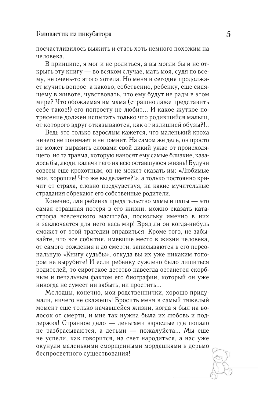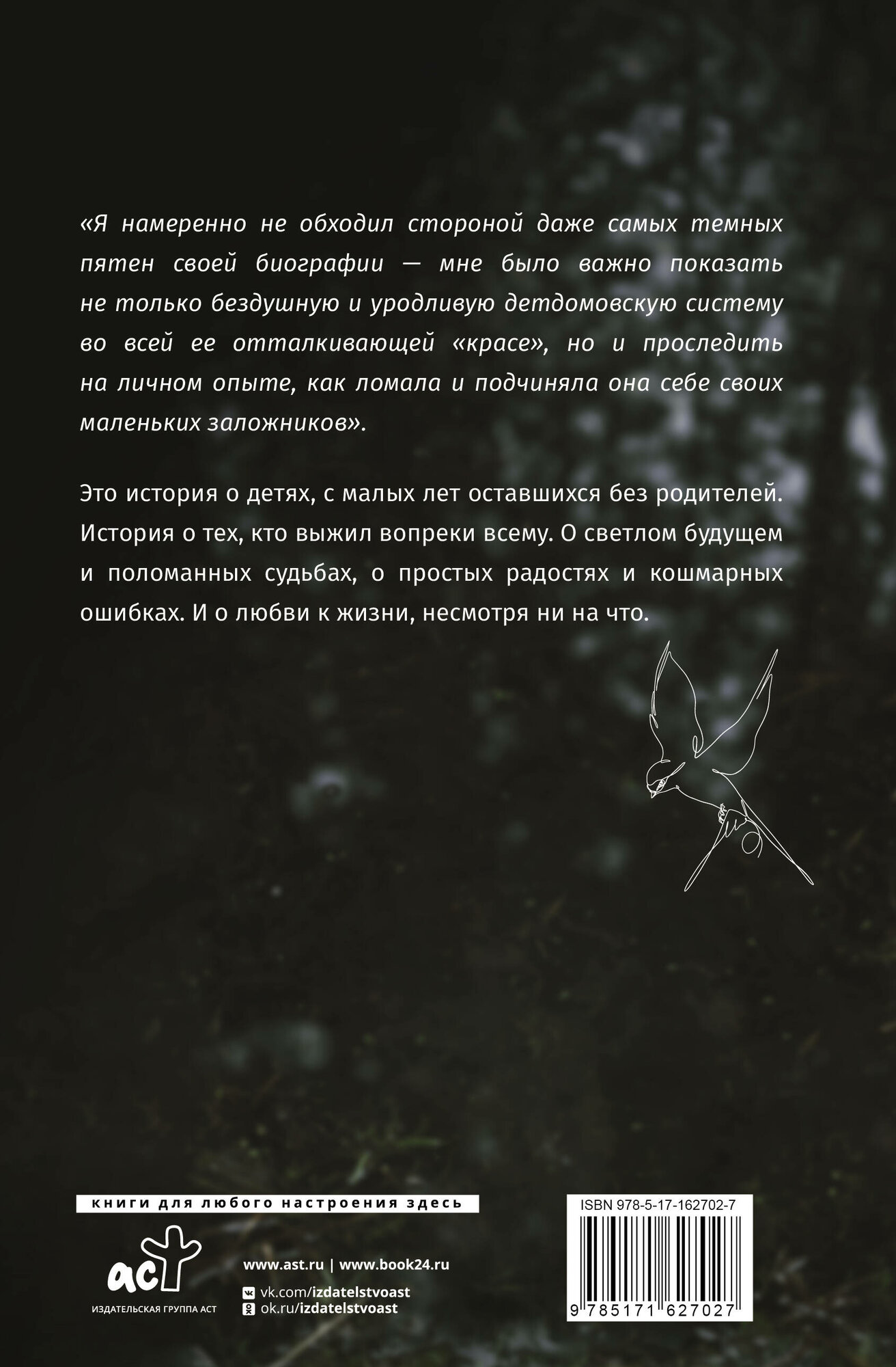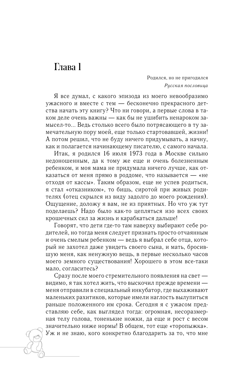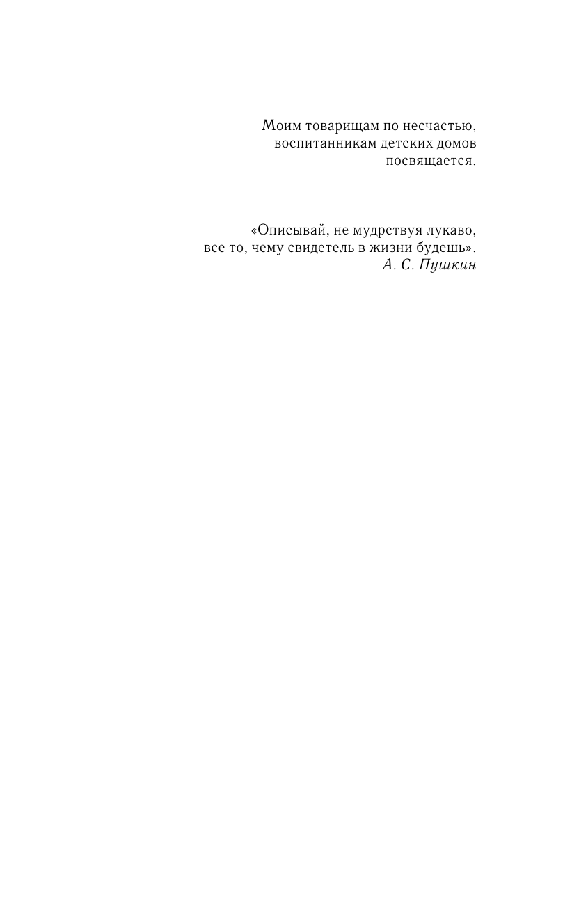 "Я намеренно не обходил стороной даже самых темных пятен своей биографии — мне было важно показать не только бездушную и уродливую детдомовскую систему во всей ее отталкивающей "красе", но и проследить на личном опыте, как ломала и подчиняла она себе своих маленьких заложников".