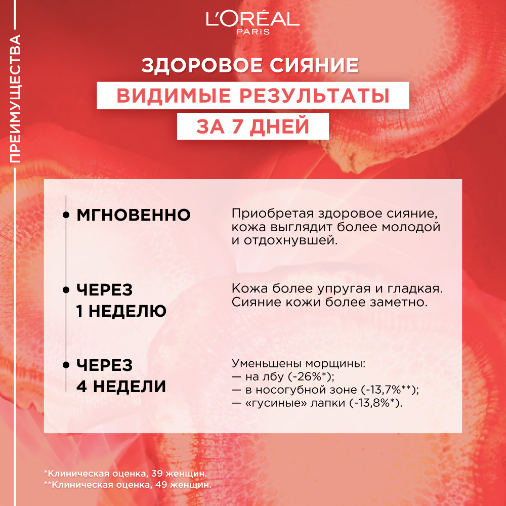 - Кожа мгновенно приобретает здоровое сияние, выглядит более молодой и отдохнувшей;