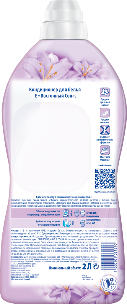 Кондиционер для белья Е Восточный Сон 4л подарит Вашему белью не только невероятную мягкость, но и изумительный аромат. Кондиционер для белья также облегчает глажку и обладает антистатическим эффектом. Для достижения большего эффекта начните знакомство с миром кондиционеров Е.