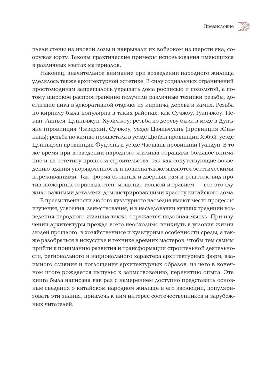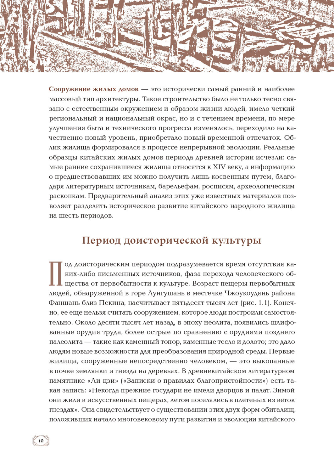 В преемственности любого культурного наследия имеют место процессы изучения, усвоения, заимствования, и в наследовании лучших традиций возведения народного жилища также отражается подобная мысль. При изучении архитектуры прежде всего необходимо вникнуть в условия жизни людей прошлого, в хозяйственные и культурные особенности среды, а также разобраться в искусстве и технике древних мастеров, чтобы тем самым прийти к пониманию развития и трансформации строительной деятельности, регионального и национального характера архитектурных форм, взаимного слияния и поглощения архитектурных образов, из чего в конечном итоге рождается импульс к заимствованию, перенятию опыта. Многовековая история, необъятная территория, огромное население и многочисленность этносов предопределили разнообразие форм традиционных жилищ. Книга состоит из двух разделов. За основу первого раздела взята хронология: подробное описание народных жилищ и анализ их исторической эволюции следуют за развитием всей цивилизации. Отправной точкой второго раздела служит классификация жилищ по типам: в нем приводятся сведения об особенностях различных домов и специфике их взаимного расположения, производится их детальный анализ.
