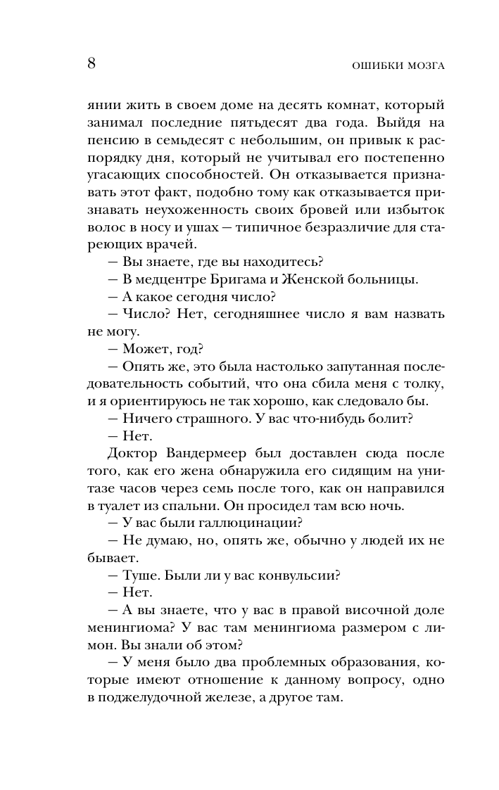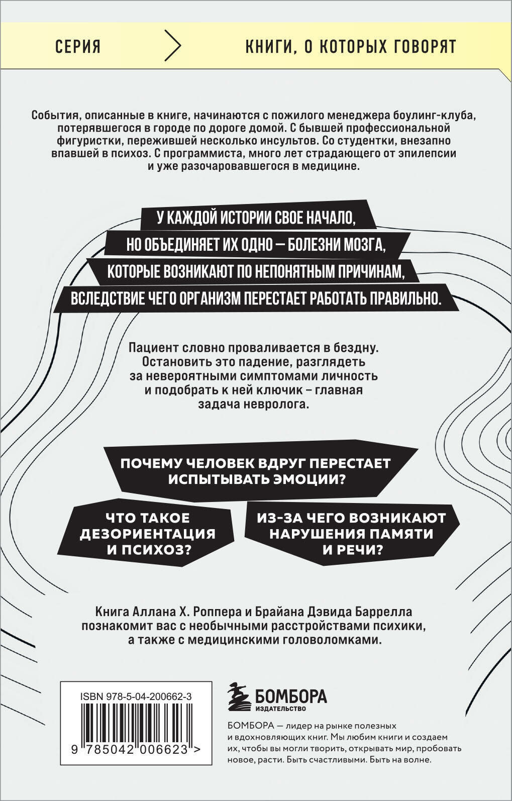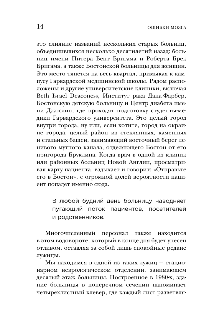 В книге собраны реальные истории пациентов неврологического отделения, людей, чьи жизни навсегда изменила болезнь. Дезориентированный пожилой менеджер боулинг-клуба, потерявшийся по дороге домой. Бывшая профессиональная фигуристка, пережившая несколько кровоизлияний в мозг. Студентка, внезапно впавшая в психоз, или молодой человек, не испытывающий никаких эмоций. Каждая история – уникальный случай, а задача невролога – не просто определить, почему мозг вдруг начал работать неправильно, но разглядеть за необычными симптомами личность. И помочь человеку, сознание которого блуждает в запутанном лабиринте, наконец выйти из него. Перед вами книга о возможностях и знаниях современной неврологии, о непростых решениях и поиске ответов, о пути в профессии, о жизни и смерти.