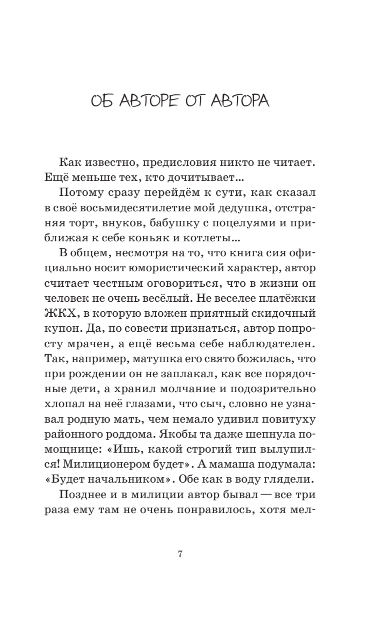 Смешные и одновременно философские рассказы заставят улыбнуться, а зачастую как следует "просмеяться" каждого, кто их прочитает. Сочные характеры, непредсказуемые повороты сюжета и все картины нашей "нешуточной, но прекрасной жизни" описаны вкусно и щедро приправлены щепоткой черного, а местами и вполне себе светлого юмора. MUST HAVE ДЛЯ ЛЮБИТЕЛЕЙ ЗОЩЕНКО И АВЕРЧЕНКО.