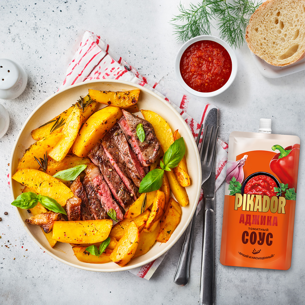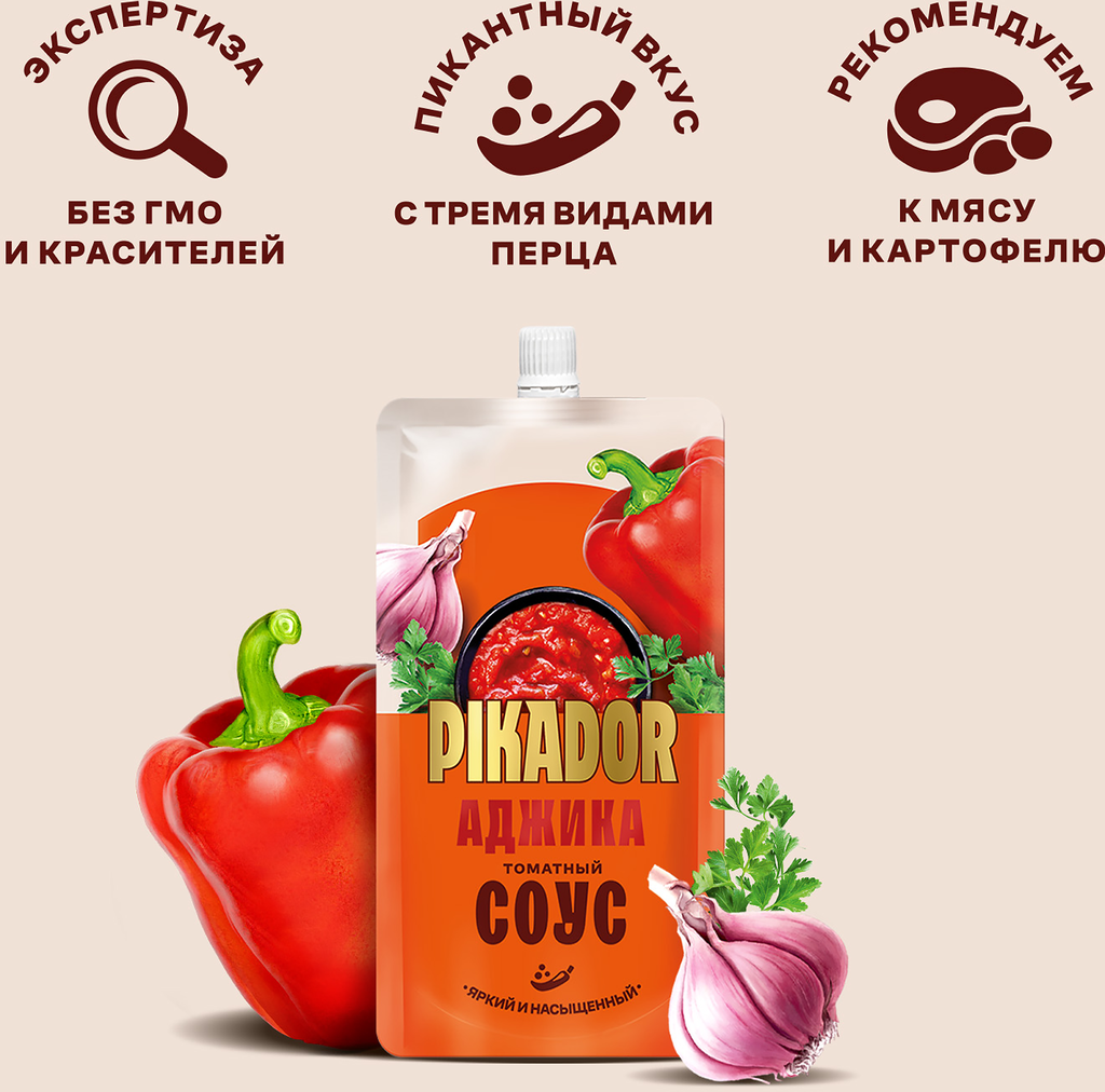 Томатный соус PIKADOR Аджика это соус к мясу, птице и гарнирам, который говорит сам за себя. Соус PIKADOR Аджика добавит остроты и пряности к говядине, свинине или птице, придавая им совершенно новый вкус.