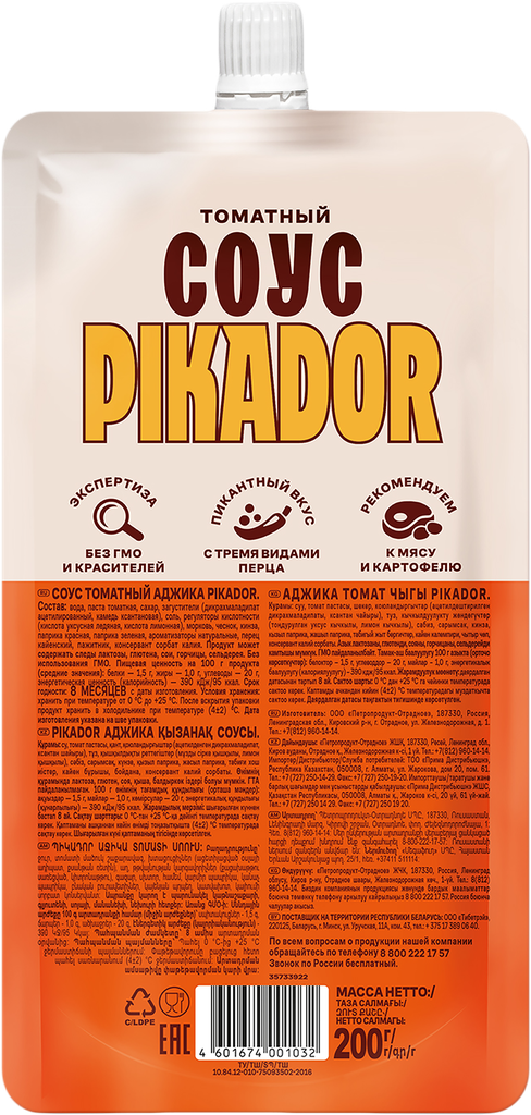 Соус PIKADOR Сацебели представлен в удобных упаковках дой-пак с крышкой весом 200 г. Дой-пак позволяет сохранить вкус и свежесть продукта в течение всего срока использования. Такая упаковка не займет много места в холодильнике или корзине для пикника.