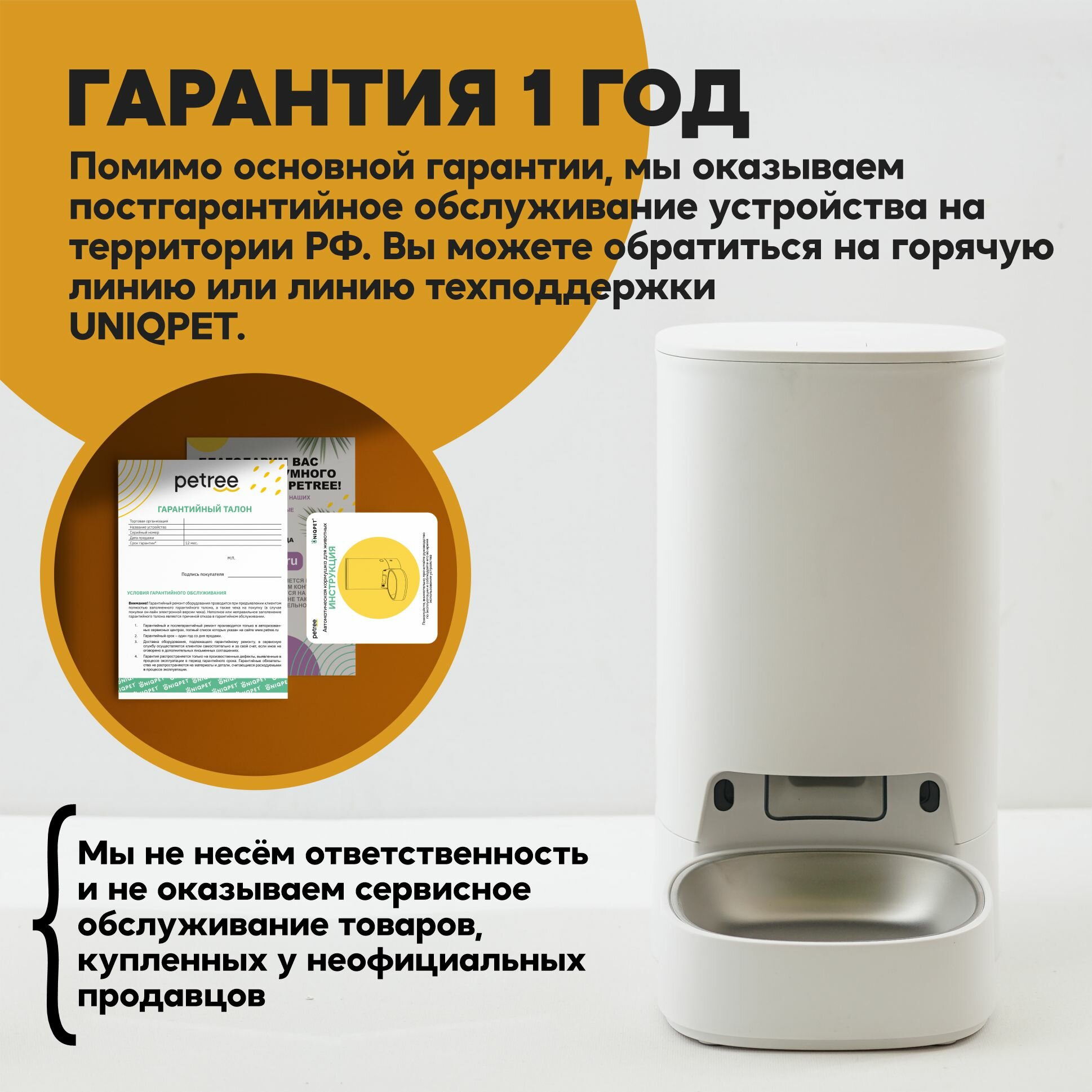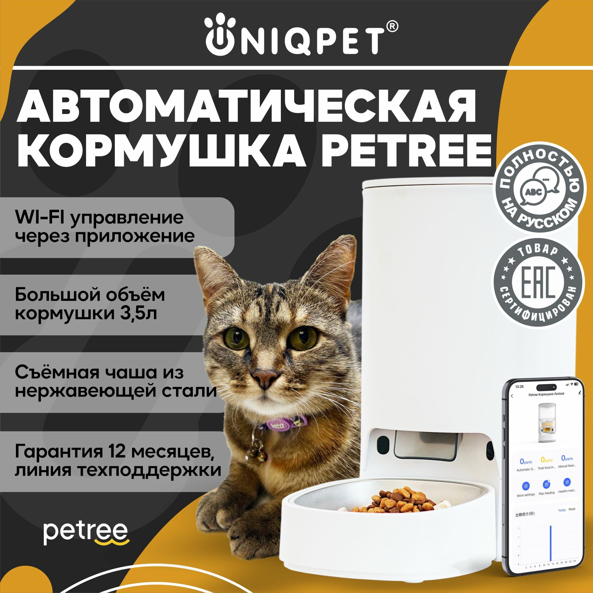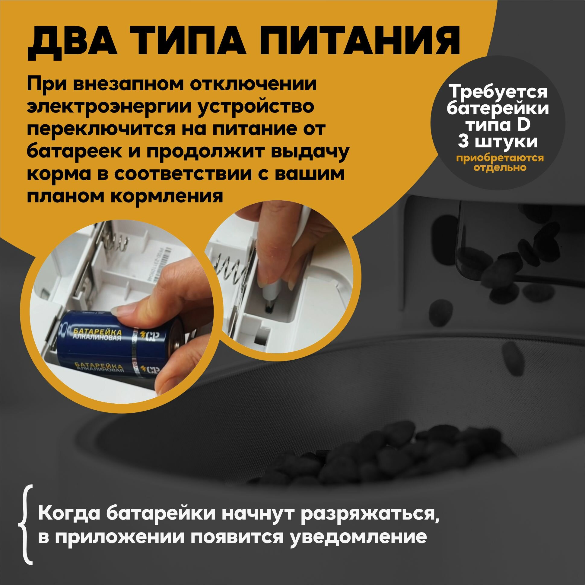 Автоматическая кормушка с большим хранилищем сухого корма на 3,5л подходит как для кошек, так и для собак мелких и средних пород. Для небольшого животного весом 4кг такого количества корма хватит примерно на 30 дней.Подойдет не только для сухого корма, но и для сублимированного.Конструкция кормушки предусматривает систему дозированной подачи корма. Встроенный вращающийся механизм обеспечивает перемешивание корма и плавную подачу через широкое отверстие. С помощью wi-fi приложения SmartLife на вашем телефоне можно настроить план автоматического кормления, отрегулировав размер порций и график подачи. Кормушка будет работать по заданным параметрам, не требуя вашего участия. Так же возможна подача корма через кнопку на устройстве.Мониторинг в режиме реального времени отслеживает остаток корма. При обнаружении нехватки или отклонении от нормы кормушка отправит уведомление на ваш телефон, а на корпусе замигает индикатор и изменит свой цвет.Материалы корпуса и материалы механизма подачи, которые контактируют с кормом не токсичны и полностью безопасны для животных и людей. Они не создают среду для размножения бактерий и широко используются в производстве посуды. Также, данные материалы не подвержены коррозии, а значит прослужат долгие годы. Съёмная чаша выполнена из нержавеющей пищевой стали 304.Кормушка работает от сети, но встроенная система аварийного питания предусматривает установку трёх батареек D (не идут в комплекте). Даже при аварийном отключении электричества кормушка продолжит работу от резервного источника питания, обеспечивая животное пищей.Если отключат интернет, то кормушка Petree продолжит работу, согласно установленному плану кормления.Автокормушка легко разбирается и не имеет глухих зон, а это значит, что вы с легкостью сможете помыть все части устройства.Конструкция с тремя ступенями защиты корма от влаги, позволяет вам наполнять бак большой упаковкой корма, а вашему питомцу ежедневно получать свежий корм. Закрытое отверстие выхода корма: закрывается после выдачи, не давая возможности доставать корм лапой. Сменный влагопоглотитель для хранения корма в баке: защищает от влаги, требует периодической замены. Верхняя крышка с силиконовой прокладкой: изолирует воздух и помогает избежать окисления гранул корма.Функция "Блокировка от детей" включается через приложение и не допускает открытия крышки кормушки.Стильная и невероятно умная кормушка Petree накормит по расписанию и сохранит спокойствие за питомца, когда Вас нет рядом!