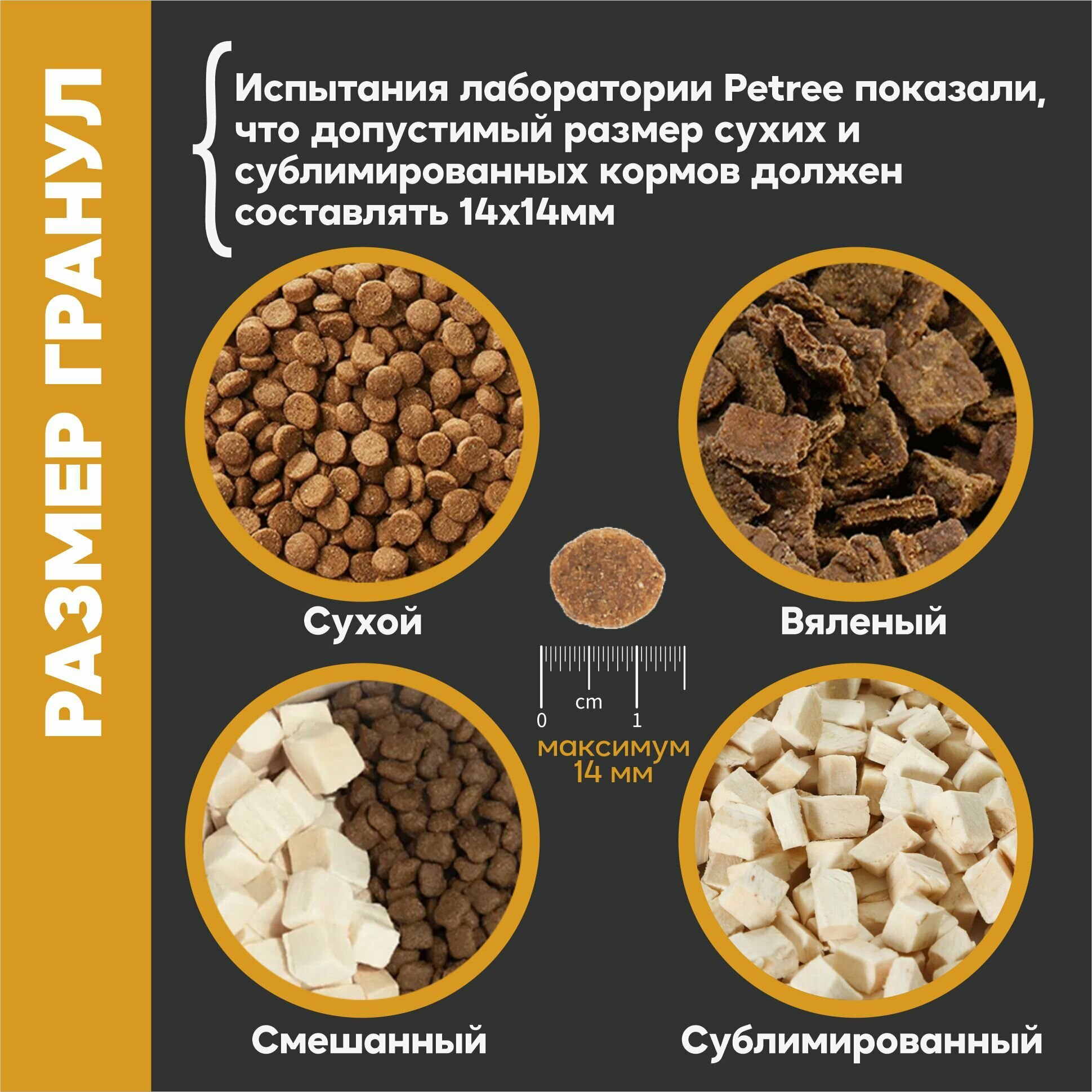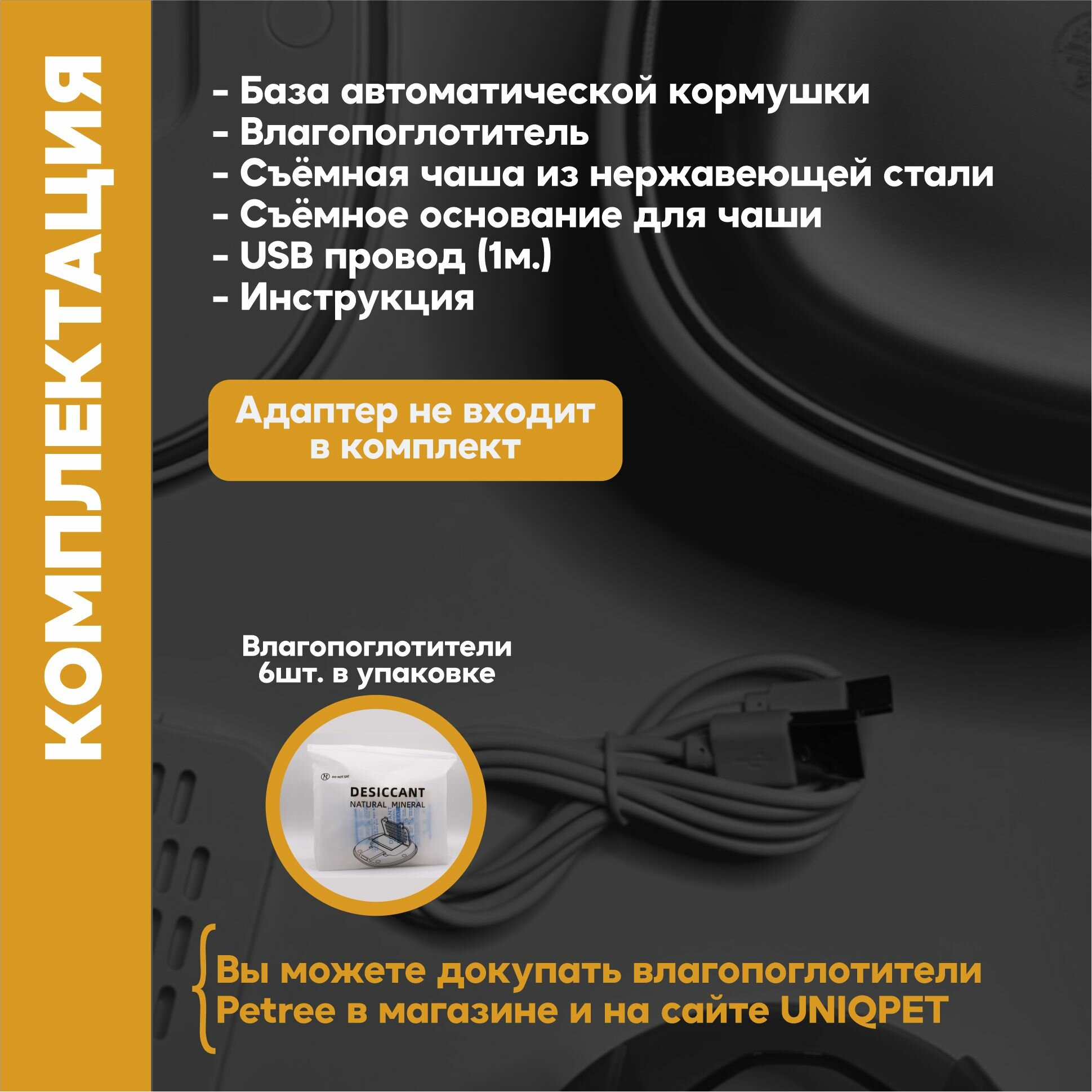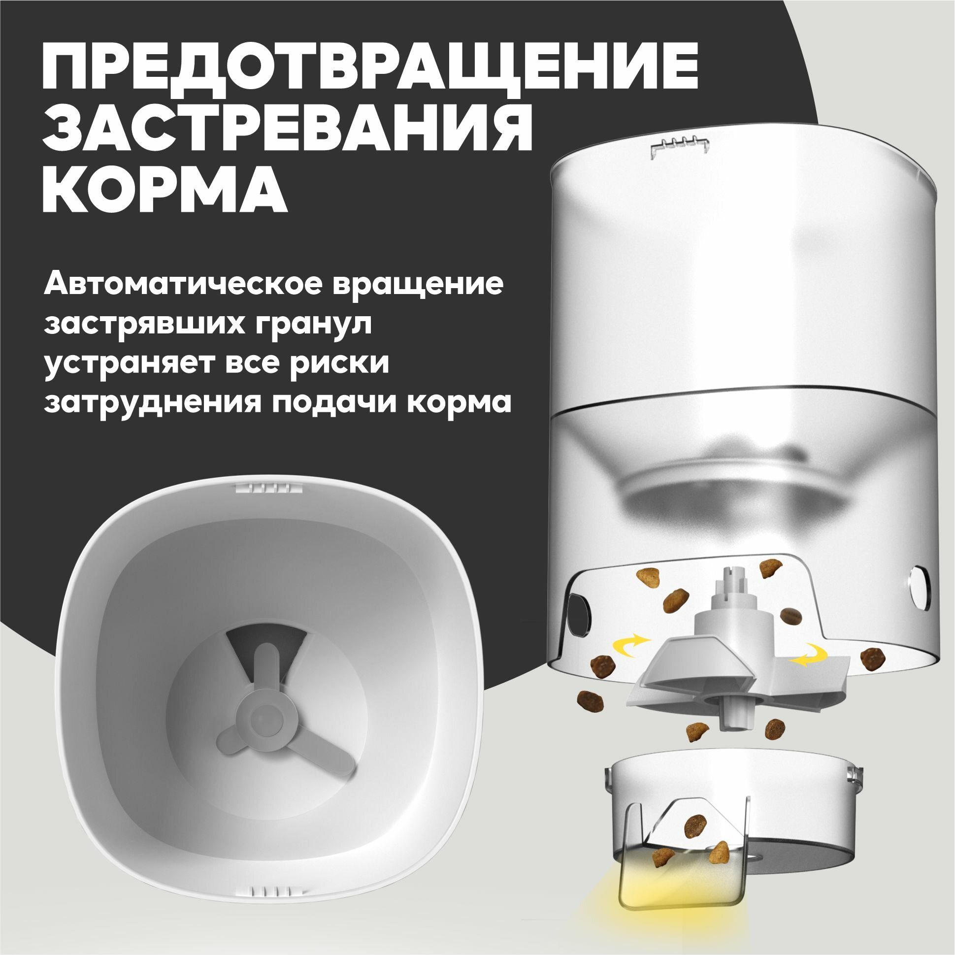 Автоматическая кормушка с большим хранилищем сухого корма на 3,5л подходит как для кошек, так и для собак мелких и средних пород. Для небольшого животного весом 4кг такого количества корма хватит примерно на 30 дней.Подойдет не только для сухого корма, но и для сублимированного.Конструкция кормушки предусматривает систему дозированной подачи корма. Встроенный вращающийся механизм обеспечивает перемешивание корма и плавную подачу через широкое отверстие. С помощью wi-fi приложения SmartLife на вашем телефоне можно настроить план автоматического кормления, отрегулировав размер порций и график подачи. Кормушка будет работать по заданным параметрам, не требуя вашего участия. Так же возможна подача корма через кнопку на устройстве.Мониторинг в режиме реального времени отслеживает остаток корма. При обнаружении нехватки или отклонении от нормы кормушка отправит уведомление на ваш телефон, а на корпусе замигает индикатор и изменит свой цвет.Материалы корпуса и материалы механизма подачи, которые контактируют с кормом не токсичны и полностью безопасны для животных и людей. Они не создают среду для размножения бактерий и широко используются в производстве посуды. Также, данные материалы не подвержены коррозии, а значит прослужат долгие годы. Съёмная чаша выполнена из нержавеющей пищевой стали 304.Кормушка работает от сети, но встроенная система аварийного питания предусматривает установку трёх батареек D (не идут в комплекте). Даже при аварийном отключении электричества кормушка продолжит работу от резервного источника питания, обеспечивая животное пищей.Если отключат интернет, то кормушка Petree продолжит работу, согласно установленному плану кормления.Автокормушка легко разбирается и не имеет глухих зон, а это значит, что вы с легкостью сможете помыть все части устройства.Конструкция с тремя ступенями защиты корма от влаги, позволяет вам наполнять бак большой упаковкой корма, а вашему питомцу ежедневно получать свежий корм. Закрытое отверстие выхода корма: закрывается после выдачи, не давая возможности доставать корм лапой. Сменный влагопоглотитель для хранения корма в баке: защищает от влаги, требует периодической замены. Верхняя крышка с силиконовой прокладкой: изолирует воздух и помогает избежать окисления гранул корма.Функция "Блокировка от детей" включается через приложение и не допускает открытия крышки кормушки.Стильная и невероятно умная кормушка Petree накормит по расписанию и сохранит спокойствие за питомца, когда Вас нет рядом!
