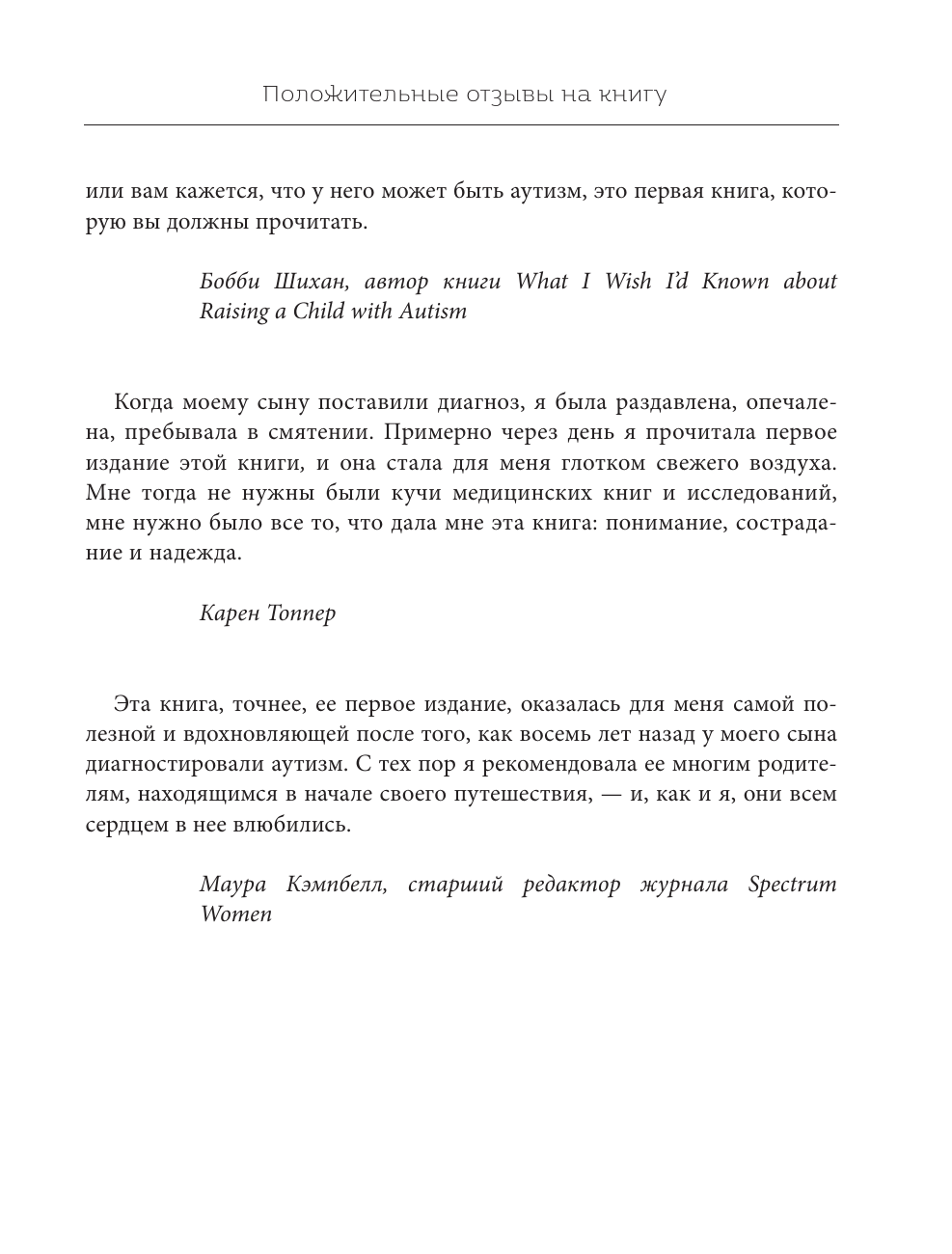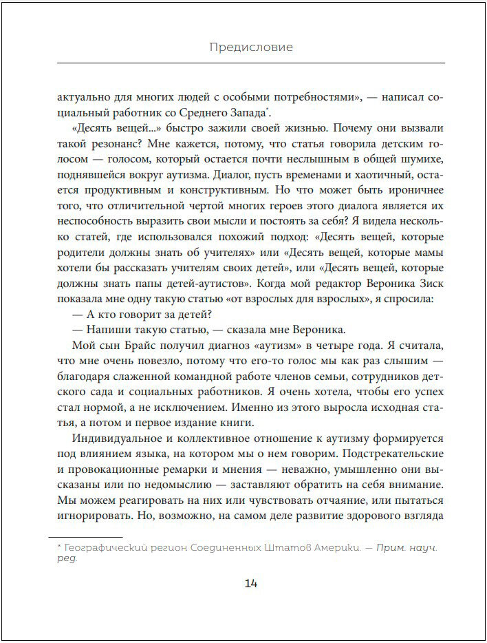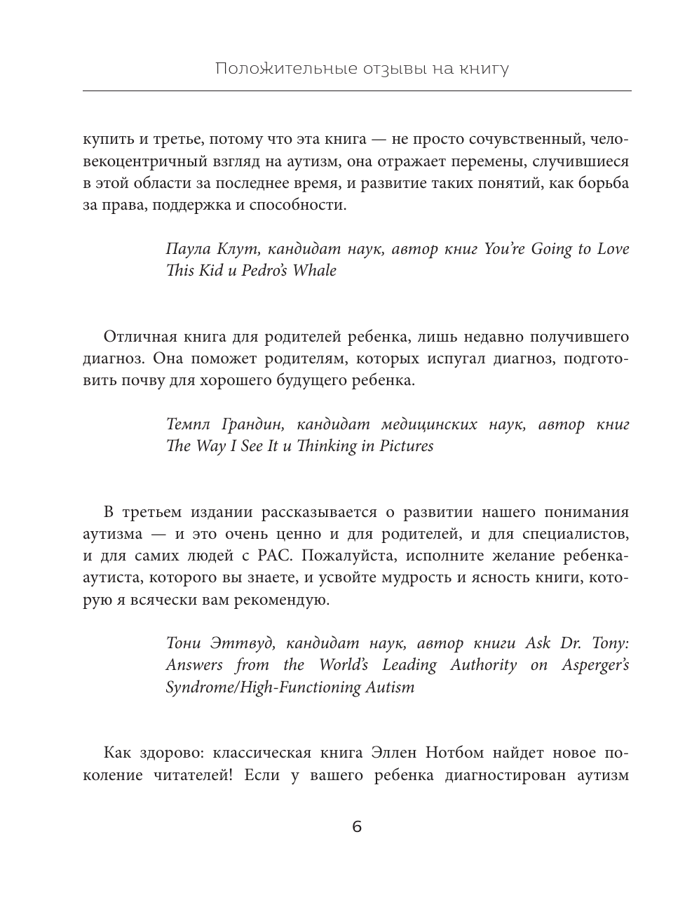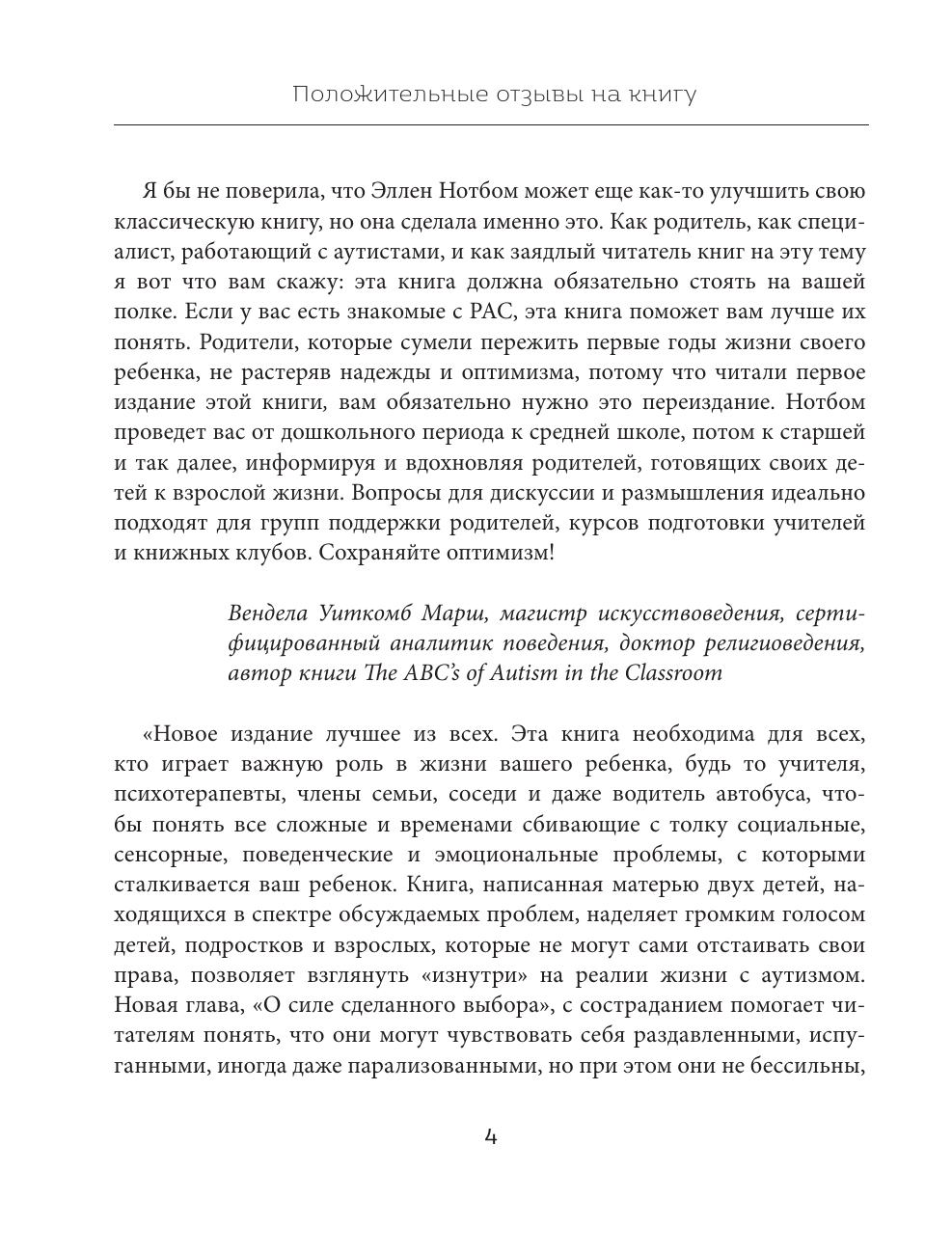 Сам по себе аутизм не ужасен. А вот если вы не понимаете его, и рядом с вами нет людей, которые его понимают, и вы не получаете помощи - это может быть действительно ужасно. Эта книга расскажет вам о верстовых столбах, которые, скорее всего, встретятся на пути, так что когда вы действительно подойдете к одному из них, то узнаете его и не станете так пугаться. Эта книга сможет говорить за вас и вашего ребенка с теми, кто должен услышать ваше послание: учителями, родителями, братьями и сестрами, родственниками супруга, нянями, тренерами, водителями автобусов, родителями ровесников, друзьями братьев и сестер, соседями. Она вооружит базовыми знаниями об основных аспектах аутизма тех, кто окружает вашего ребенка. Это понимание сильно укрепит способность вашего ребенка вырасти в независимого и продуктивного взрослого. Аутизм - сложнейшее явление, но в рамках этой книги мириады его характеристик разделены на четыре фундаментальные области: - сенсорную обработку; - общение; - навыки социального понимания; - взаимодействия и проблемы с самооценкой и полноценностью. Каждый из разделов описывает возможные варианты поведения, их причины, а также способы коррекции.