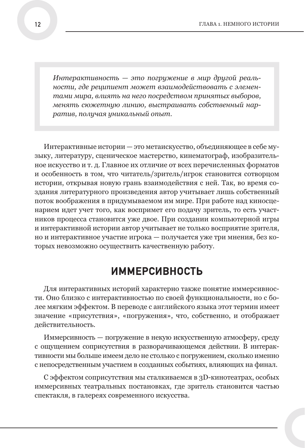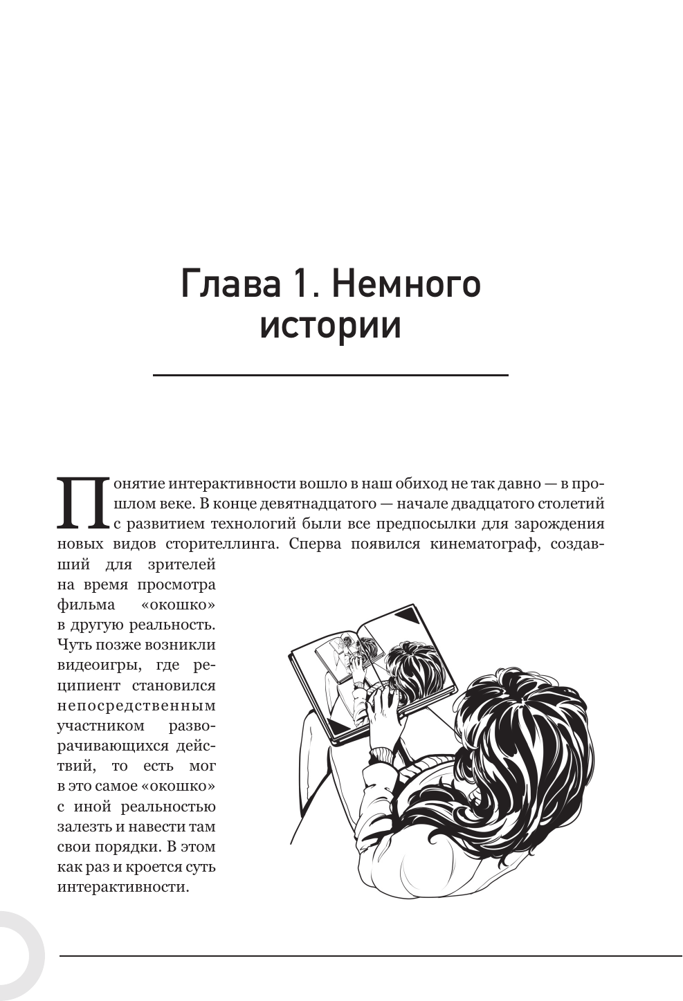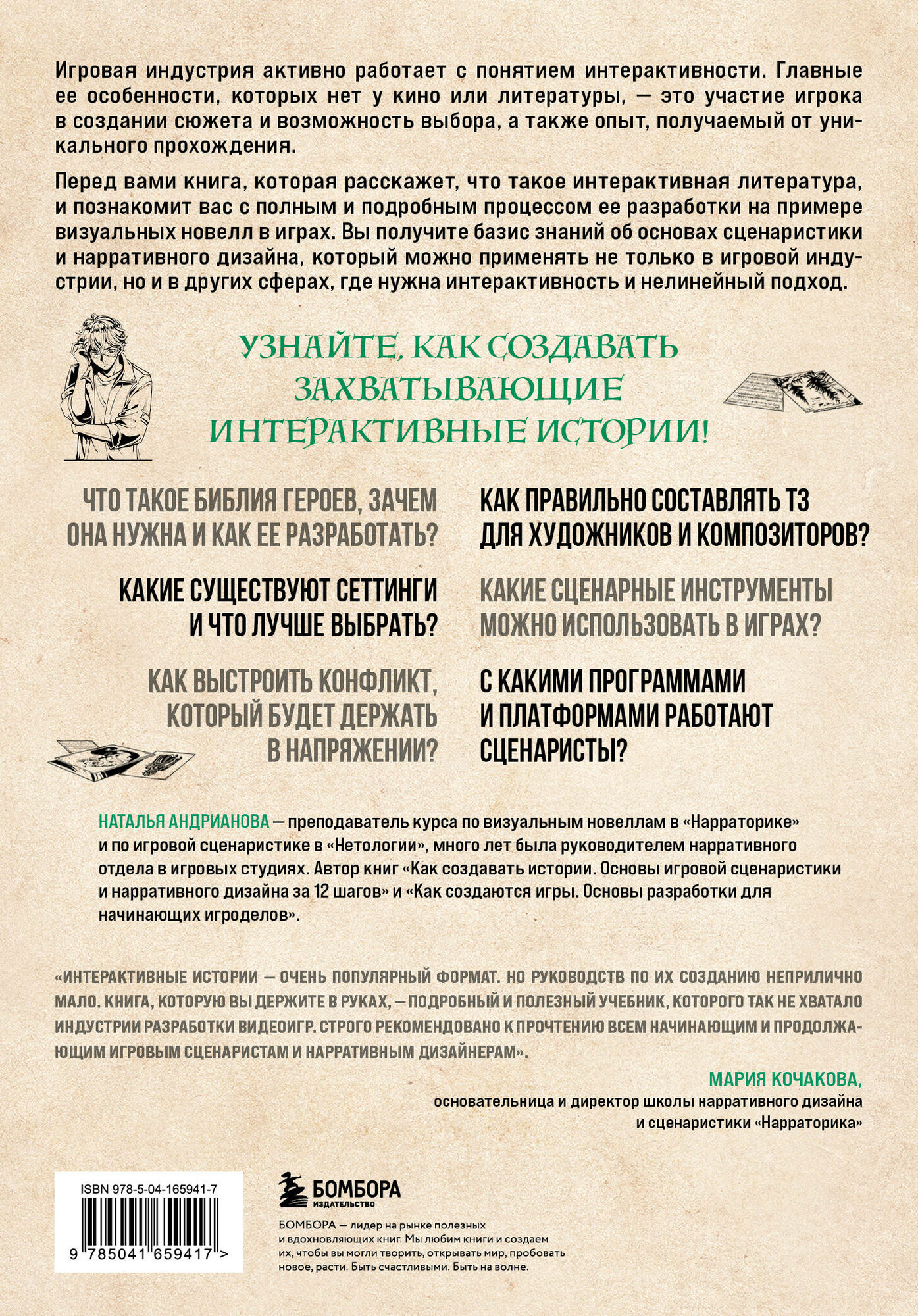 Игровая индустрия активно работает с понятием интерактивности. Главные его особенности, которых нет у кино или литературы, - это соучастие игрока в создании сюжета и возможность выбора, а также опыт, получаемый от уникального прохождения. Перед вами книга, которая расскажет, что такое интерактивная литература, и познакомит вас с полным и подробным процессом ее разработки на примере визуальных новелл в играх. Вы получите базис знаний об основах сценаристики и нарративного дизайна, который можно применять не только в игровой индустрии, но и в других сферах, где нужна интерактивность и нелинейный подход. Узнайте, как создавать захватывающие интерактивные истории! - Что такое библия героев, зачем она нужна и как ее разработать? - Какие существуют сеттинги и что лучше выбрать? - Как выстроить конфликт, который будет держать в напряжении? - Какие сценарные инструменты можно использовать в играх? - Как правильно составлять ТЗ для художников и композиторов? - С какими программами и платформами работают сценаристы? Наталья Андрианова - преподаватель курса по визуальным новеллам в "Нарраторике" и по игровой сценаристике в "Нетологии", много лет была руководителем нарративного отдела в игровых студиях. Автор книг "Как создавать истории. Основы игровой сценаристики и нарративного дизайна за 12 шагов" и "Как создаются игры. Основы разработки для начинающих игроделов". "Интерактивные истории - очень популярный формат. Но руководств по их созданию неприлично мало. Книга, которую вы держите в руках, - подробный и полезный учебник, которого так не хватало индустрии разработки видеоигр. Строго рекомендовано к прочтению всем начинающим и продолжающим игровым сценаристам и нарративным дизайнерам". - Мария Кочакова, основательница и директор школы нарративного дизайна и сценаристики "Нарраторика"