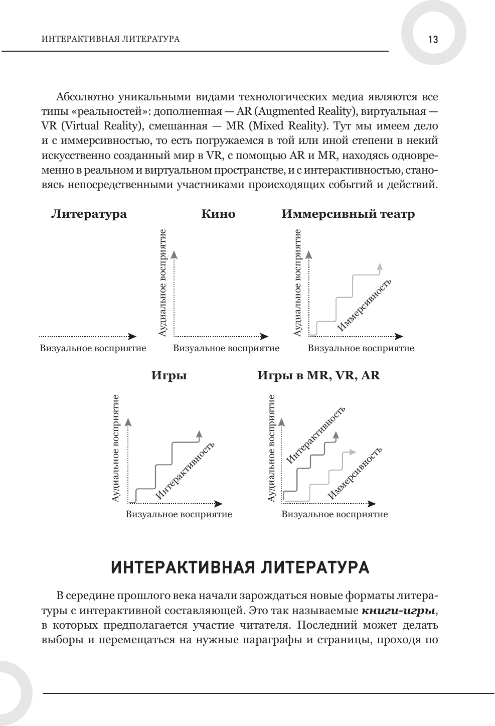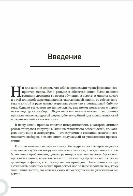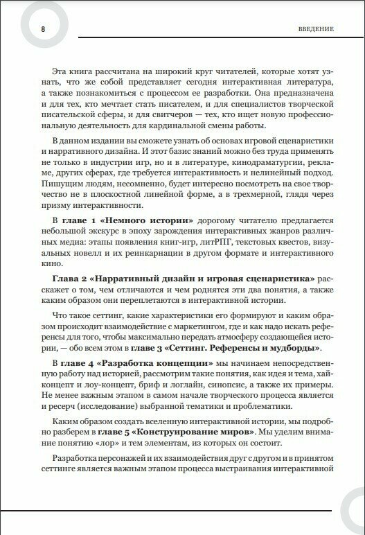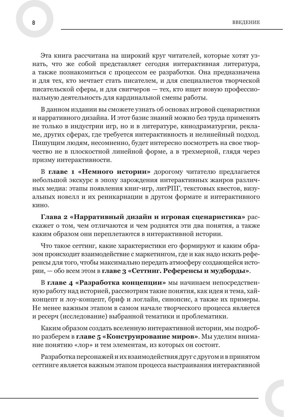 Игровая индустрия активно работает с понятием интерактивности. Главные его особенности, которых нет у кино или литературы, - это соучастие игрока в создании сюжета и возможность выбора, а также опыт, получаемый от уникального прохождения. Перед вами книга, которая расскажет, что такое интерактивная литература, и познакомит вас с полным и подробным процессом ее разработки на примере визуальных новелл в играх. Вы получите базис знаний об основах сценаристики и нарративного дизайна, который можно применять не только в игровой индустрии, но и в других сферах, где нужна интерактивность и нелинейный подход. Узнайте, как создавать захватывающие интерактивные истории! - Что такое библия героев, зачем она нужна и как ее разработать? - Какие существуют сеттинги и что лучше выбрать? - Как выстроить конфликт, который будет держать в напряжении? - Какие сценарные инструменты можно использовать в играх? - Как правильно составлять ТЗ для художников и композиторов? - С какими программами и платформами работают сценаристы? Наталья Андрианова - преподаватель курса по визуальным новеллам в "Нарраторике" и по игровой сценаристике в "Нетологии", много лет была руководителем нарративного отдела в игровых студиях. Автор книг "Как создавать истории. Основы игровой сценаристики и нарративного дизайна за 12 шагов" и "Как создаются игры. Основы разработки для начинающих игроделов". "Интерактивные истории - очень популярный формат. Но руководств по их созданию неприлично мало. Книга, которую вы держите в руках, - подробный и полезный учебник, которого так не хватало индустрии разработки видеоигр. Строго рекомендовано к прочтению всем начинающим и продолжающим игровым сценаристам и нарративным дизайнерам". - Мария Кочакова, основательница и директор школы нарративного дизайна и сценаристики "Нарраторика"