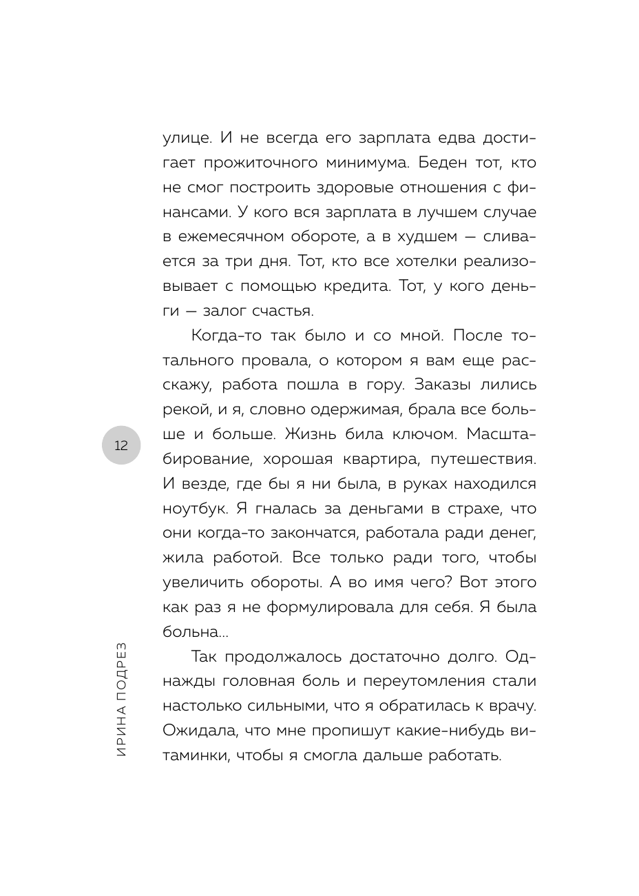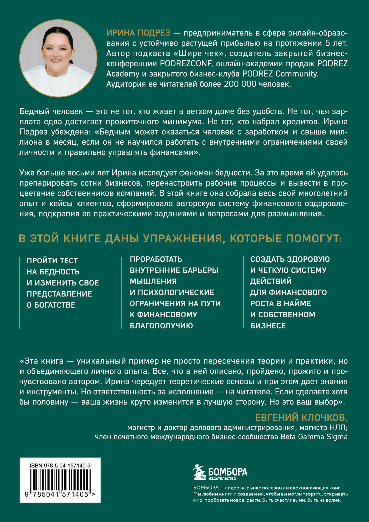Бедный человек - это не тот, кто живет в ветхом доме без удобств. Не тот, чья зарплата едва достигает прожиточного минимума. Не тот, кто набрал кредитов. Ирина Подрез убеждена: "Бедность - это свойство нашей психики и мышления, а уже потом, как следствие, качество наших материальных результатов, способность их удерживать и преумножать. Бедным может оказаться человек с заработком и свыше миллиона в месяц, если он не научился работать с внутренними ограничениями своей личности и правильно действовать на устойчивый результат и здоровый рост". Уже больше восьми лет Ирина исследует феномен бедности. За это время ей удалось препарировать сотни бизнесов, перенастроить рабочие процессы и вывести в процветание собственников компаний. В этой книге она собрала весь свой многолетний опыт и кейсы клиентов, сформировала авторскую систему финансового оздоровления, подкрепив ее практическими заданиями и вопросами для размышления. Эта книга даст вам упражнения, которые помогут: - пройти тест на бедность и изменить свое представление о богатстве; - проработать внутренние барьеры мышления и психологические ограничения на пути к финансовому благополучию; - повысить уровень дохода в найме и собственном бизнесе; - создать здоровую и четкую систему действий для финансового роста. Об авторе: Ирина Подрез - предприниматель, эксперт в продажах и маркетинге. В 2015 году окончила университет Телекоммуникаций им. проф. Бонч-Бруевича по специализации "бизнес-информатика". В 2018 году получила магистерскую степень по стратегическому менеджменту. С 2018 года ведет блог про системный рост бизнеса и психологию. Аудитория ее читателей более 200 000 человек. Ирина является автором популярного медиа-проекта "Шире чек". Лучший подкаст в категории "Бизнес" 2021 г. В 2022 году основала online-академию "Podrez. Academy", обучение в которой прошли уже более 10 000 человек. В 2024 году открыла бизнес-клуб "Podrez Community", который объединяет сильных предпринимателей и дает им возможность быстрого роста и масштабирования. Идейный вдохновитель закрытой бизнес-конференции "Podrezconf". Эксперт федеральных СМИ и автор публикаций в ТОП-изданиях. Цитаты: "Беден тот, кто не смог построить здоровые отношения с финансами". "Финансово здоровые люди говорят о целях, планах, решениях. Они говорят о впечатлениях, событиях, путешествиях. Говорят о хобби, новых увлечениях, обсуждают кино и искусство. Разговоры бедных людей наполнены проблемами. На работе, дома, с друзьями. Кто куда пошел, кто что сделал, кому кто что сказал, кто кому что ответил. Речь бедных людей сильно сконцентрирована на страдании и ощущении безысходности". "Свобода подразумевает, что вы все сделали своими собственными руками, и это ваш личный выбор. И ваши действия привели туда, где вы сейчас есть". "С каждым витком влияние убеждений становится менее интенсивными, и формируется навык справляться с ними быстрее и легче". "Если у вас чего-то нет, значит, вторичные выгоды сильно перевешивают те плюсы, которые вы получаете". Отзыв: "Эта книга - уникальный пример не просто пересечения теории и практики, но и объединяющего личного опыта. Все, что в ней описано - пройдено, прожито и прочувствовано автором. При этом, несколько раз ловил себя на мысли, что речь идет о моем прошлом, о моих личных ситуациях и моих взаимоотношениях с окружающим миром. Думаю, что когда цели сх