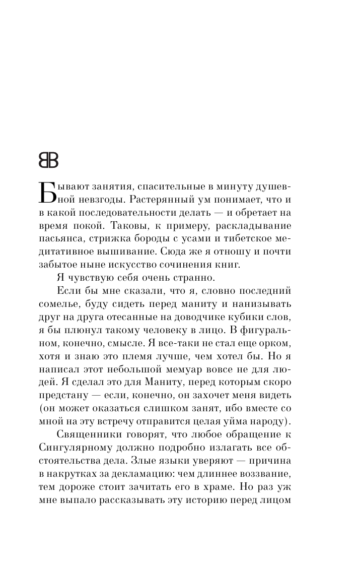 Бывают занятия, спасительные в минуту душевной невзгоды. Растерянный ум понимает, что и в какой последовательности делать — и обретает на время покой. Таковы, к примеру, раскладывание пасьянса, стрижка бороды с усами и тибетское медитативное вышивание. Сюда же я отношу и почти забытое ныне искусство сочинения книг.