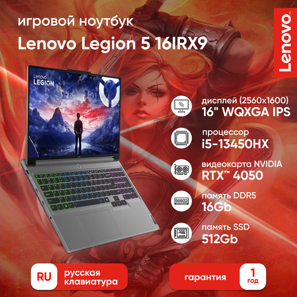 Ноутбук Lenovo 83DG0039RK i5-13450HX/16GB/512GB SSD/RTX 4050 6GB/16" WQXGA IPS/WiFi/BT/cam/noOS/grey Legion 5 16IRX9