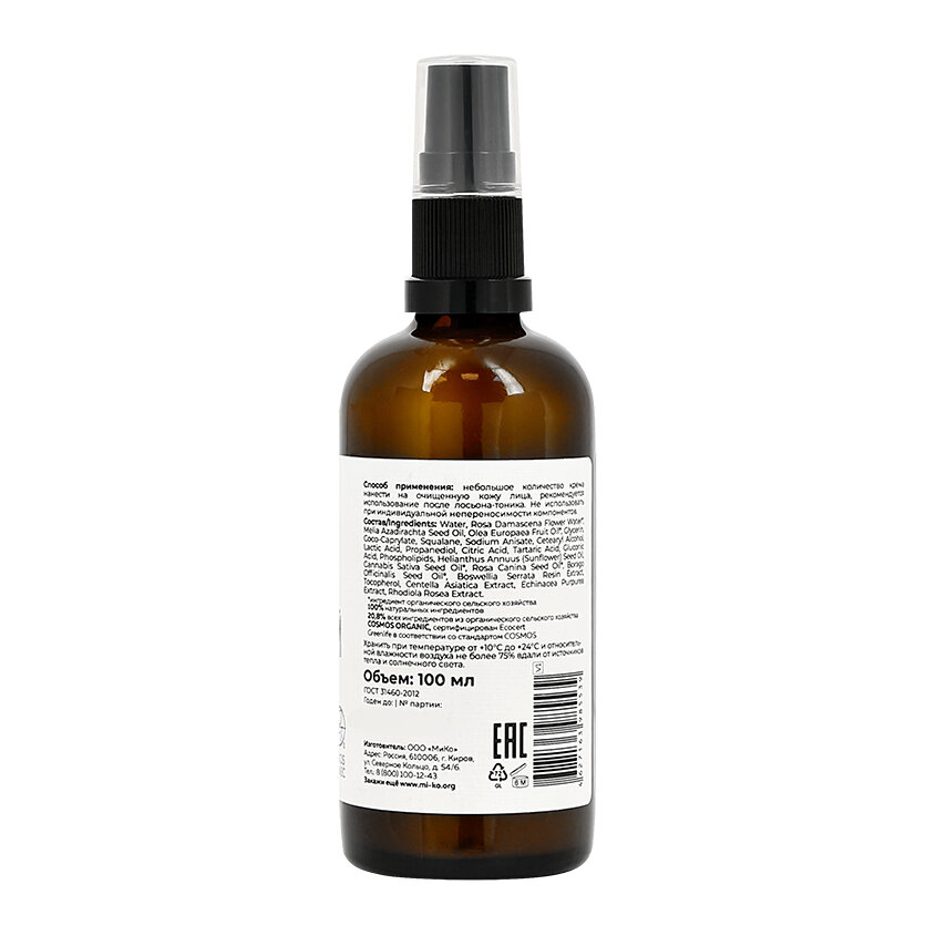 | Химический состав | Water, Rosa Damascena Flower Water*, Melia Azadirachta Seed Oil, Olea Europaea Fruit Oil*, Glycerin, Coco-Caprylate, Squalane, Sodium Anistate, Cetearyl Alcohol, Lactic Acid, Propanediol, Citric Acid, Tartaric Acid, Gluconic Acid, Phospholipids, Helianthus Annuus (Sunflower) Seed Oil, Cannabis Sativa Seed Oil*, Rosa Canina Seed Oil*, Borago Officinalis Seed Oil*, Boswellia Serrata Resin Extract, Tocopherol, Centella Asiatica Extract, Echinacea Purpurea Extract, Rhodiola Rosea Extract. *Ингредиент органического сельского хозяйства. |