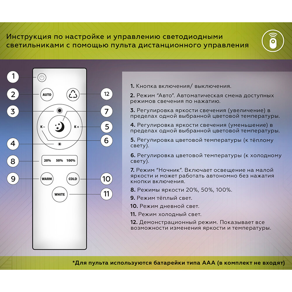 | Цветовая температура, K | Теплый свет (1500-3200 К), Дневной свет (3500-4500 К), Белый свет (5000-6500 К), Изменяемый |