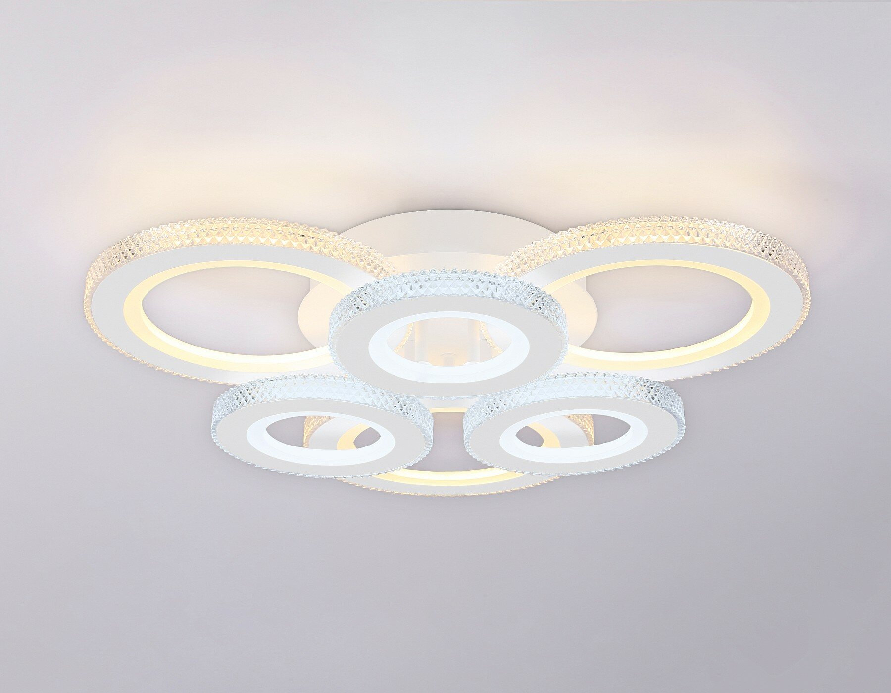 Современный потолочный светодиодный светильник, коллекция ACRYLICA. Модель представлена в современном стиле Неоклассика. Светильник выполнен в белом цвете, состоит из 6 акриловых плафонов на металлическом каркасе. Эта модель оснащена встроенными светодиодами, благодаря чему вы забудете о замене дополнительных ламп. Так же с помощью инфракрасного пульта вы сможете регулировать цветовую температуру, яркость освещения. Данная модель подходит для натяжных потолков и будет прекрасным дополнением в любом помещении.