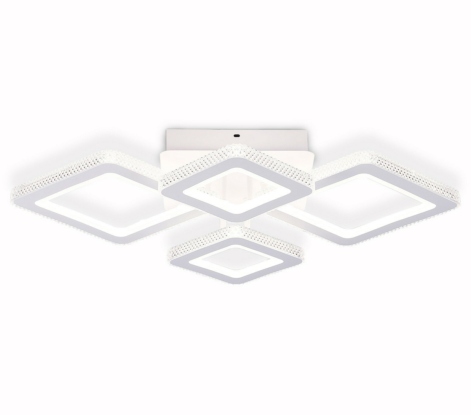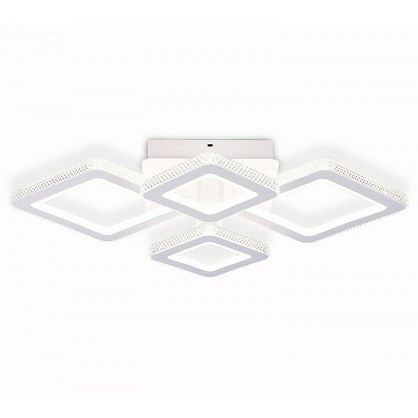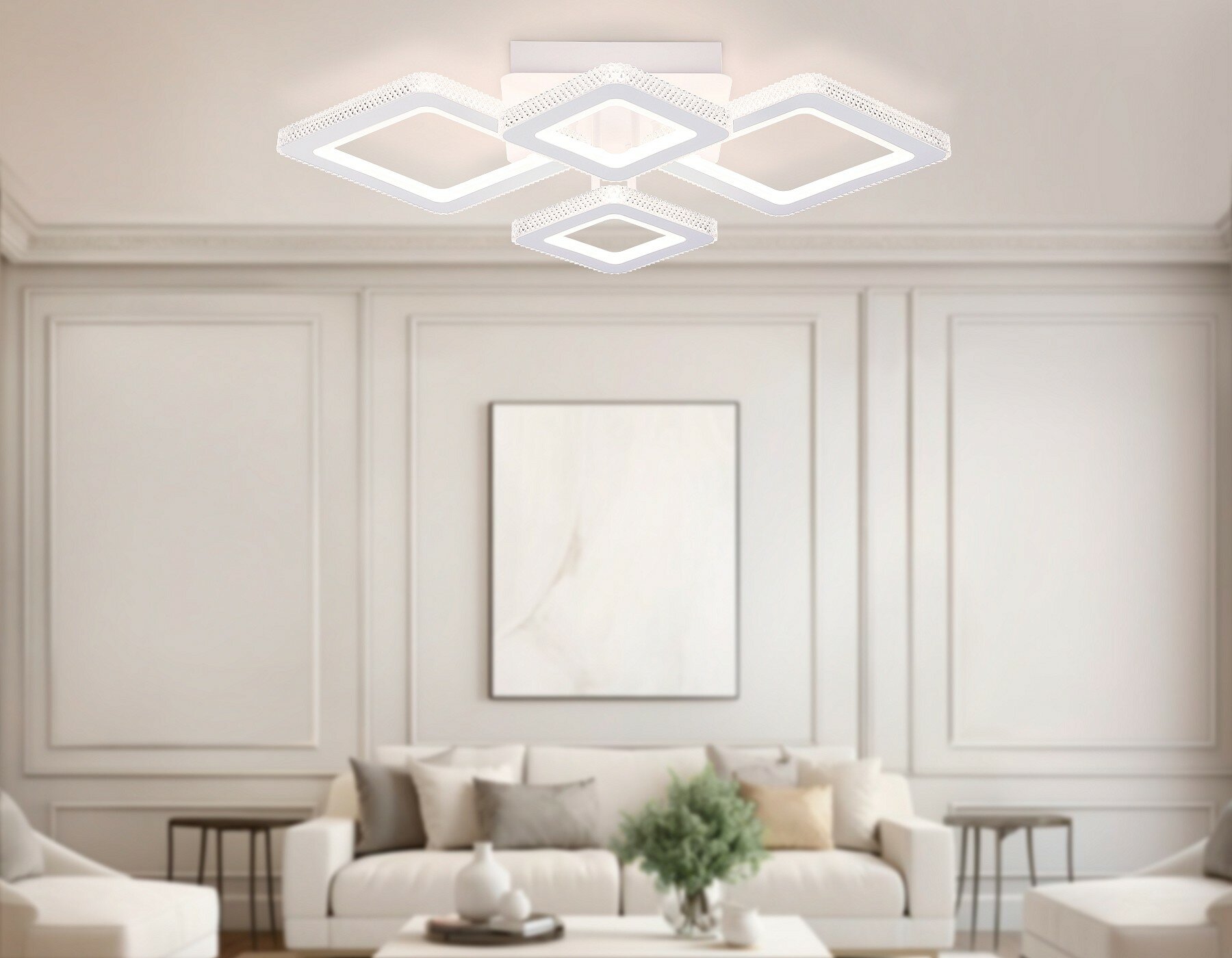 Современный потолочный светодиодный светильник, коллекция ACRYLICA. Модель представлена в современном стиле Неоклассика. Светильник выполнен в белом цвете, формы ромба, состоит из 4 акриловых плафонов на металлическом каркасе. Эта модель оснащена встроенными светодиодами, благодаря чему вы забудете о замене дополнительных ламп. Так же с помощью инфракрасного пульта вы сможете регулировать цветовую температуру, яркость освещения и ночной режим. Данная модель подходит для натяжных потолков и будет прекрасным дополнением в любом помещении.